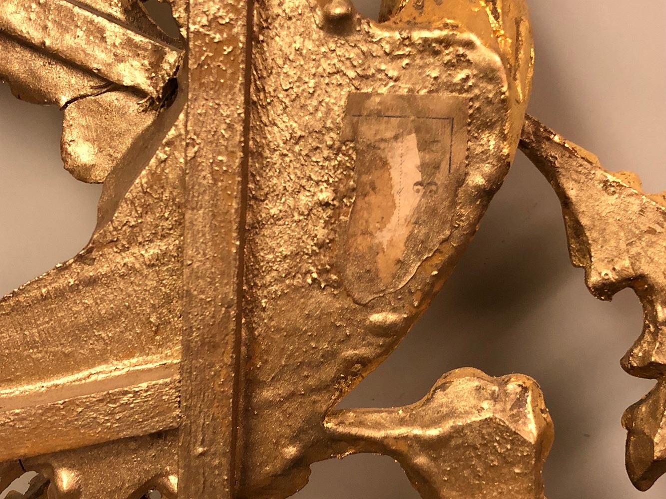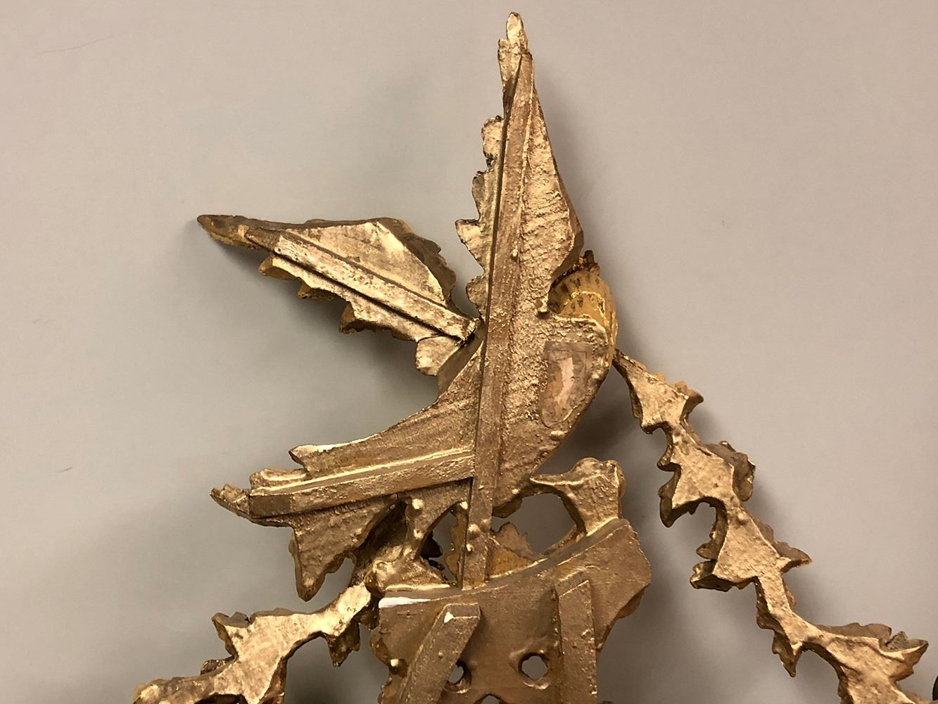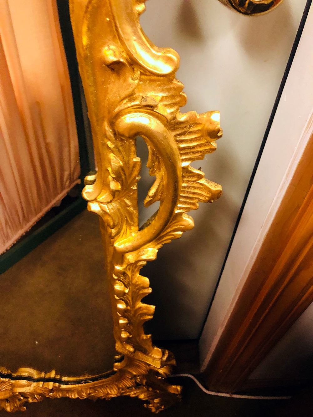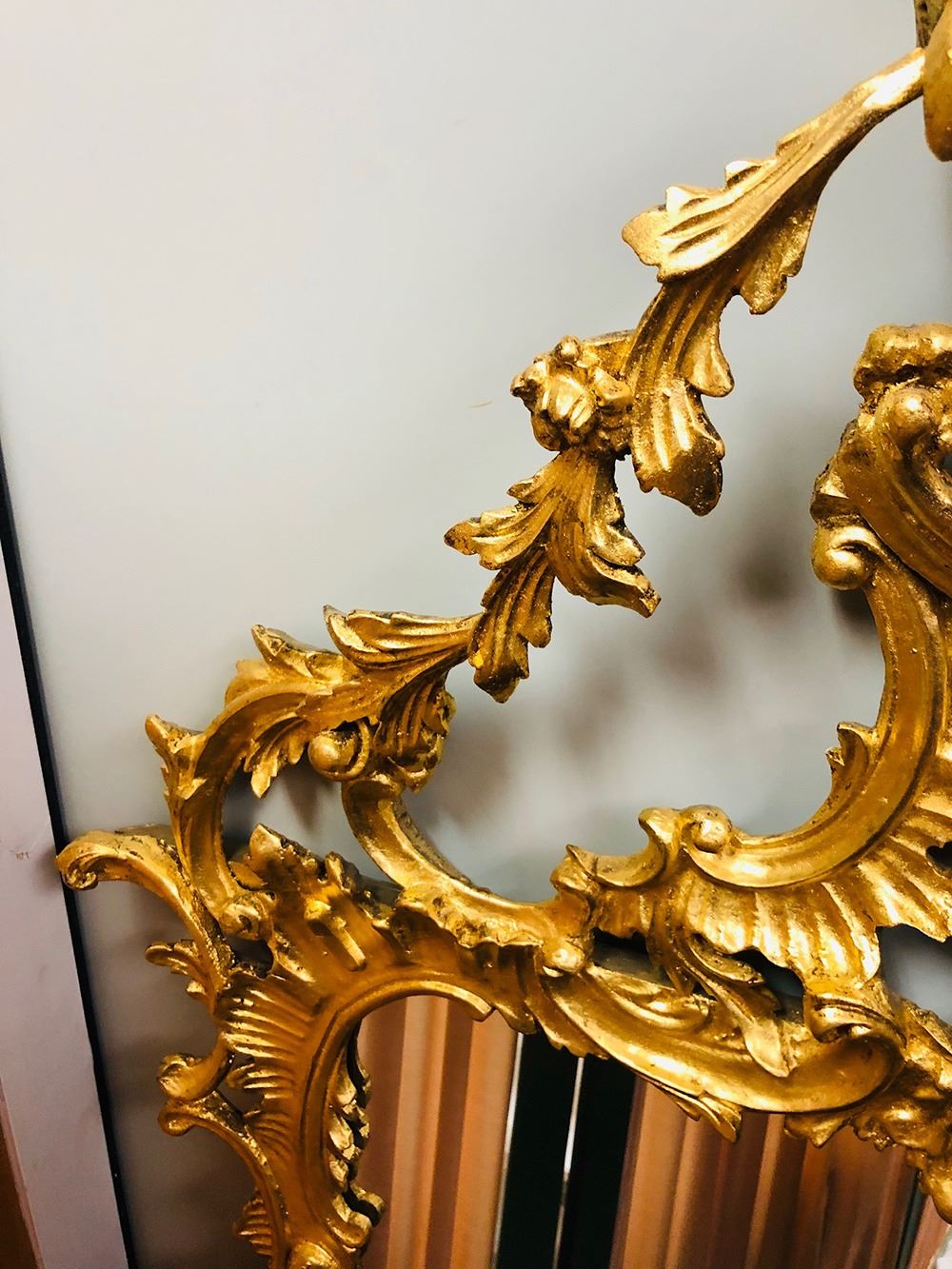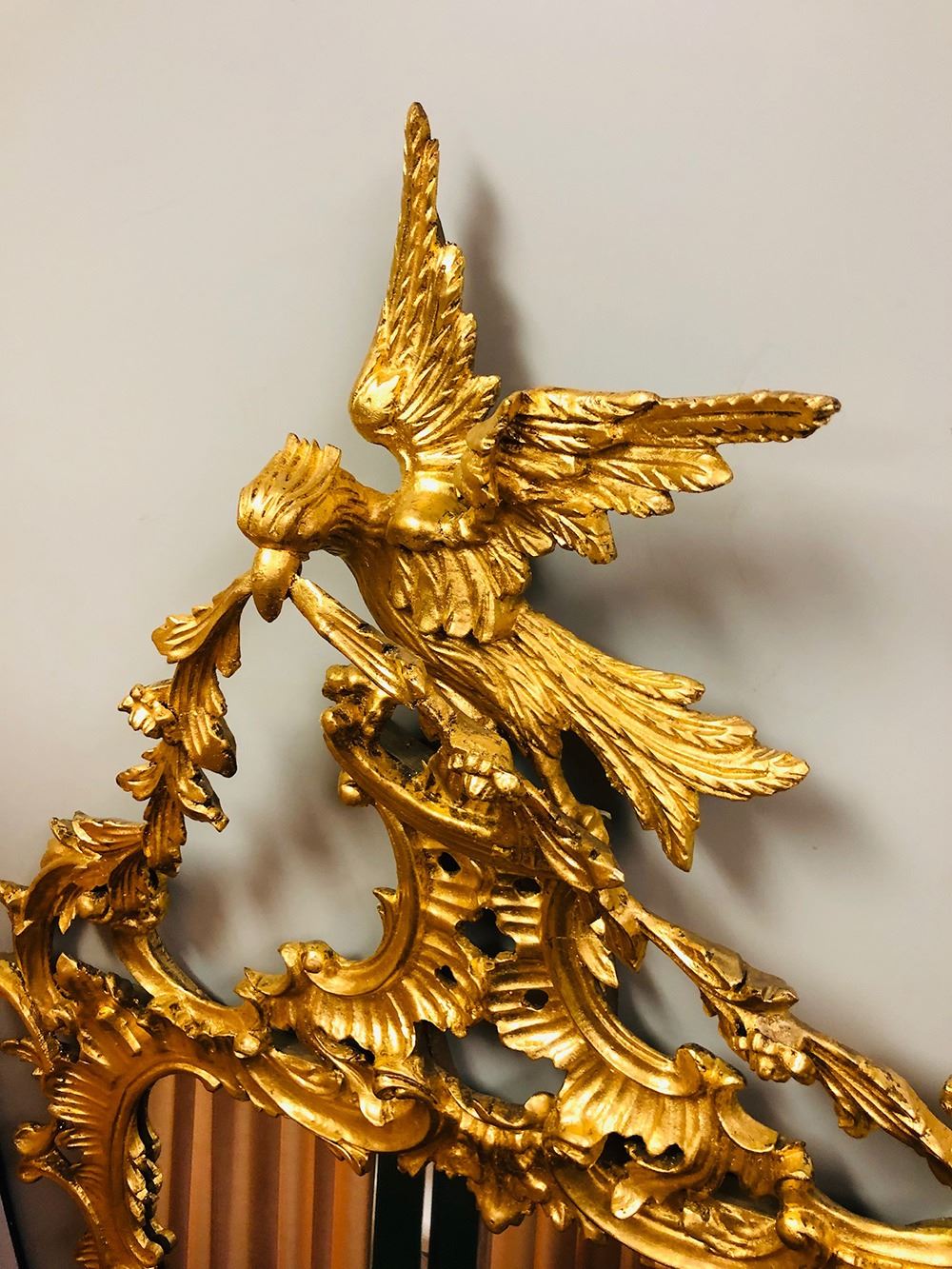 High Style gold gilt mirror with phoenix, very decorative, floral with pergoda like gold gilt. Measures approx. 64 inches tall x 32 inches wide.