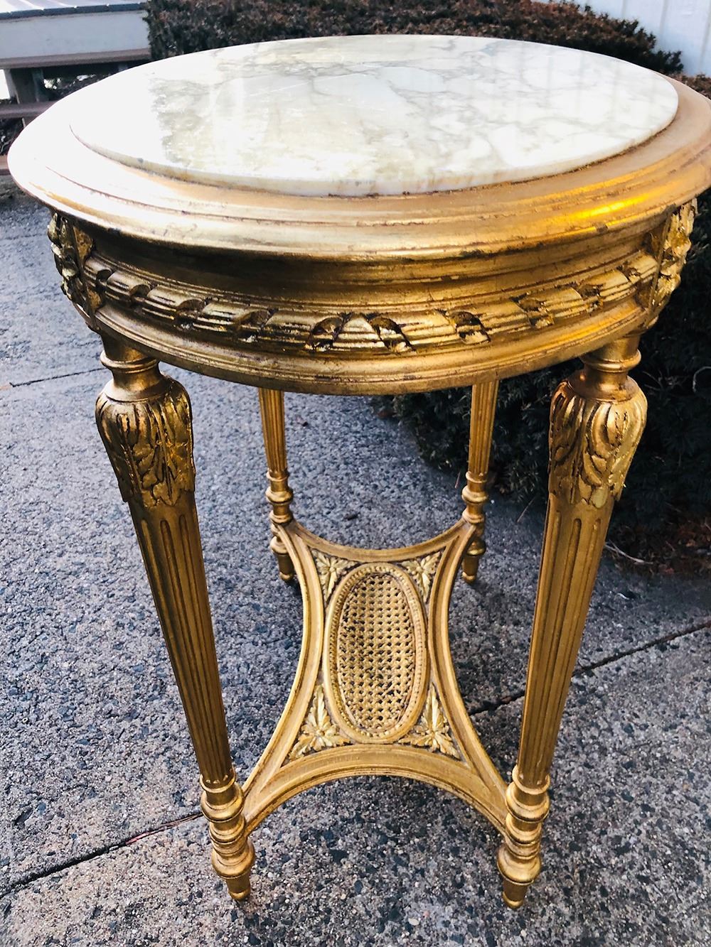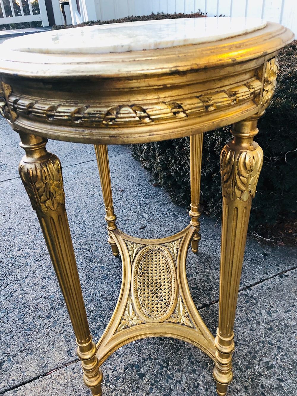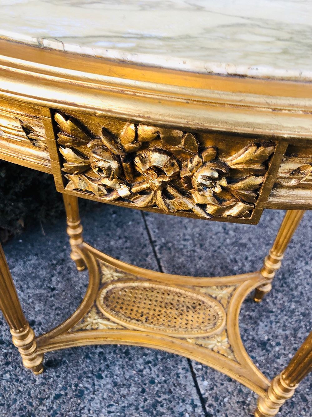 High Style gold gilt carved side table with marble top, cained bottom shelf.