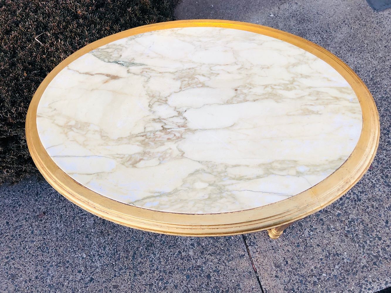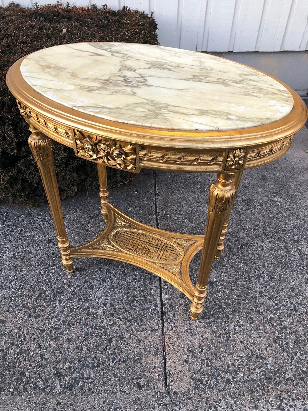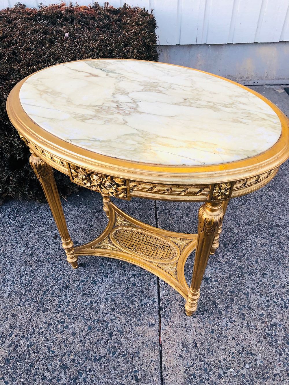 High Style gold gilt carved side table with marble top, cained bottom shelf.