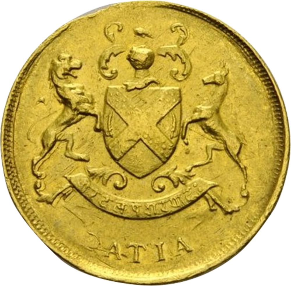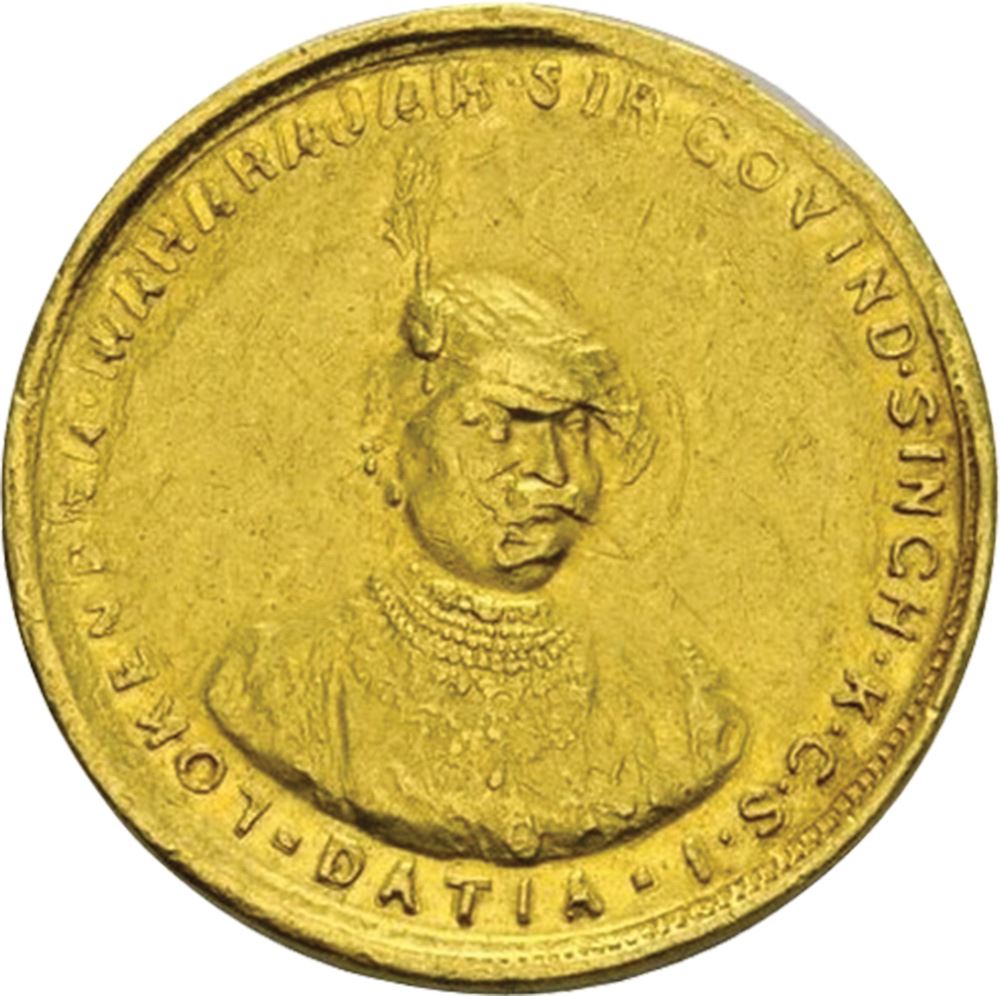 Datia, Govind Singh,Gold 1/2 Mohur Nazarana, Obv:portraitbust of govind singh right, Rev:coat of arms, 5.35g, (KM X # 1),about very fine, Extremely Rare.It should be noted that the half mohurs of Datia are somewhat weakly struck as it is and comes in the same condition. Same type was sold 2 years ago for Rs. 1,75,000 excluding hammer commission.