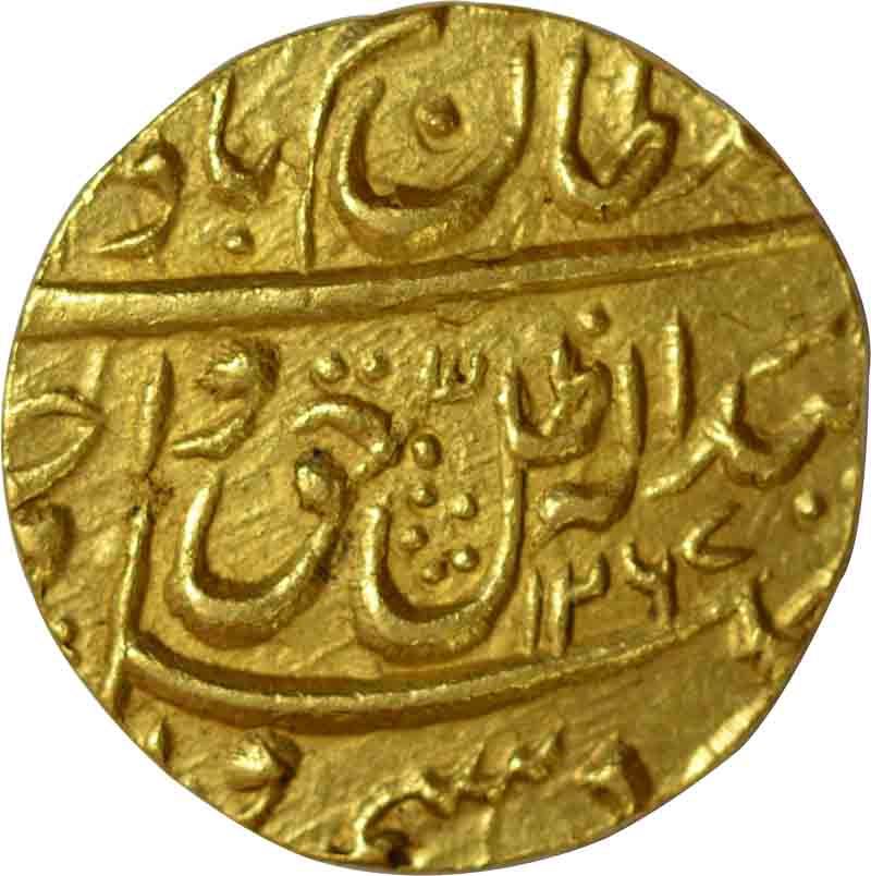 Gold Half Mohur of Awadh State of Wajid Ali Shah of Lucknow Mint.