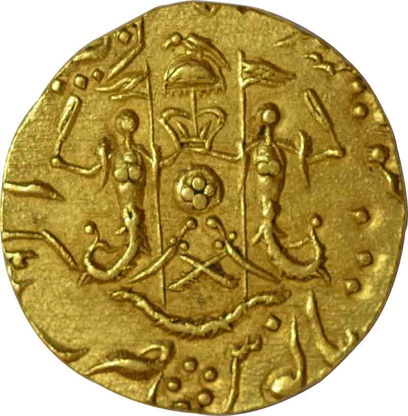 Awadh, Wajid Ali Shah, Lucknow, Gold½ Mohur (Ashrafi), Obv: "tayid elah zille haque" couplet, Rev: bait-al-sultanat lucknow mulk awadh, parasol above crown, flanked by mermaids holding flag, crossed swords below, (KM # 376), 5.4g, 16.17mm, about extremely fine, Extremely Rare.