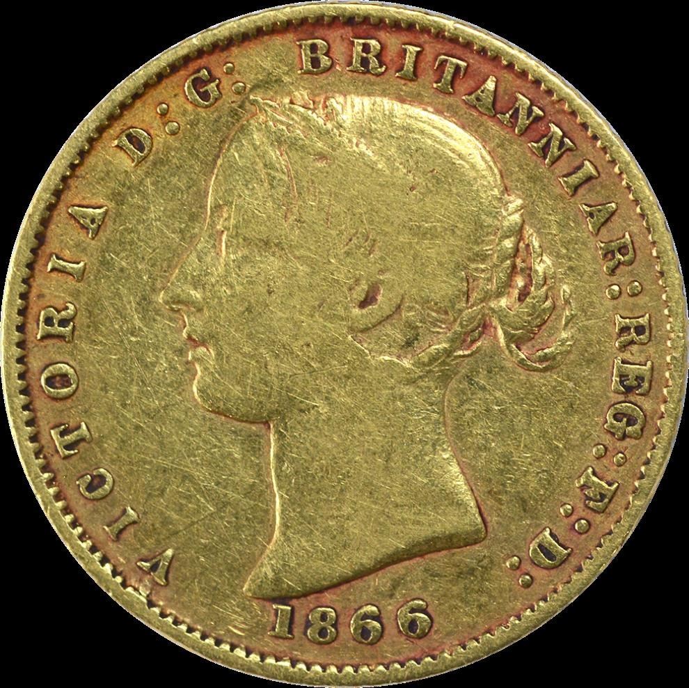 Australia, Queen Victoria,Sydney Mint,Gold 1/2 Sovereign,1866, Obv: young queen victoria-second type hair style, legend: VICTORIA D: G: BRITANNIAR REG:F:D:, Rev: sydney mint, legend: SYDNEY MINT AUSTRALIA HALF SOVEREIGN, 3.88g, 19.26mm, about extremely fine, Very Rare.