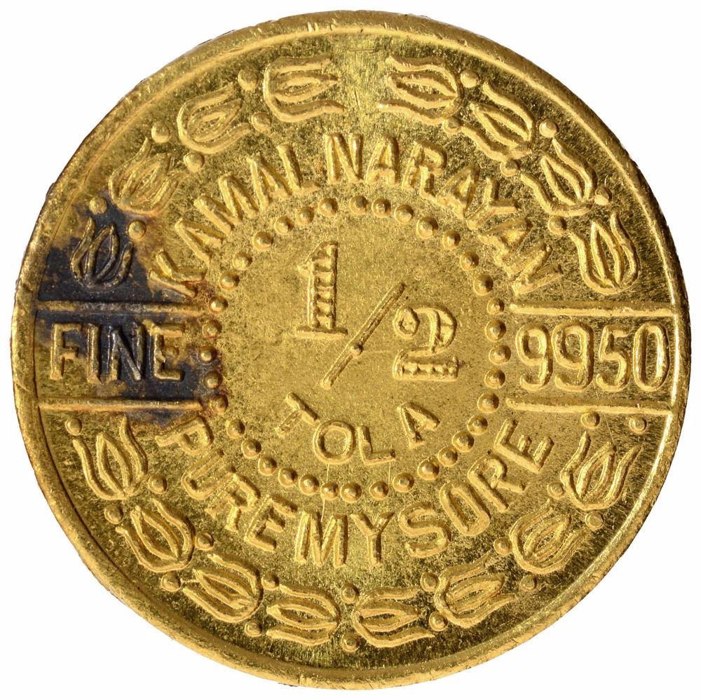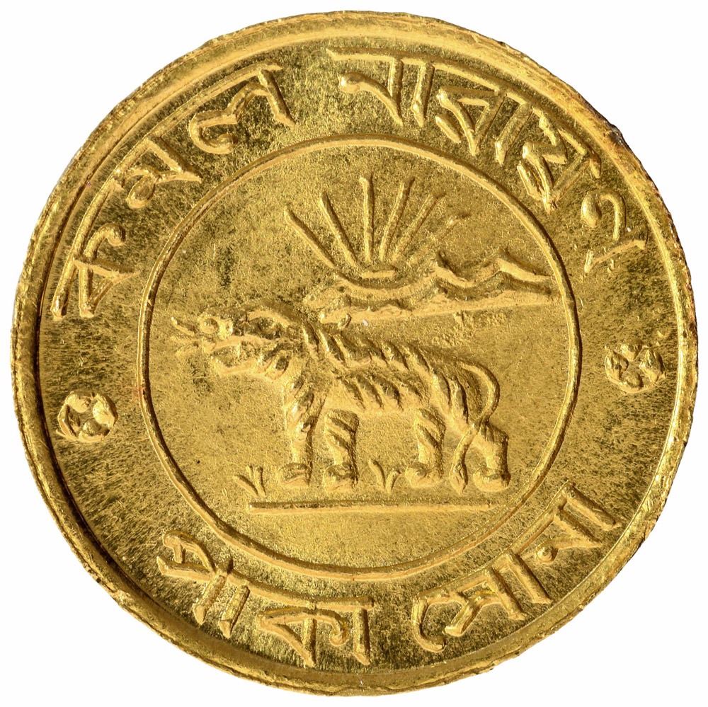 Gold Token, 1/2 Tola, Obv:denomination 1/2 tola, above kamal narayan,Rev:bengal tiger behind sun rising,5.80g,18.53mm,about extremely fine,Very Rare.