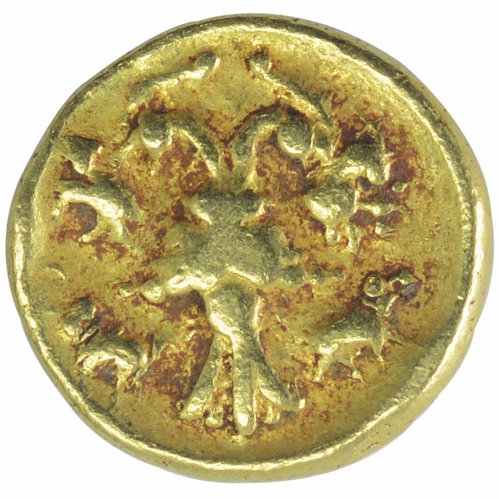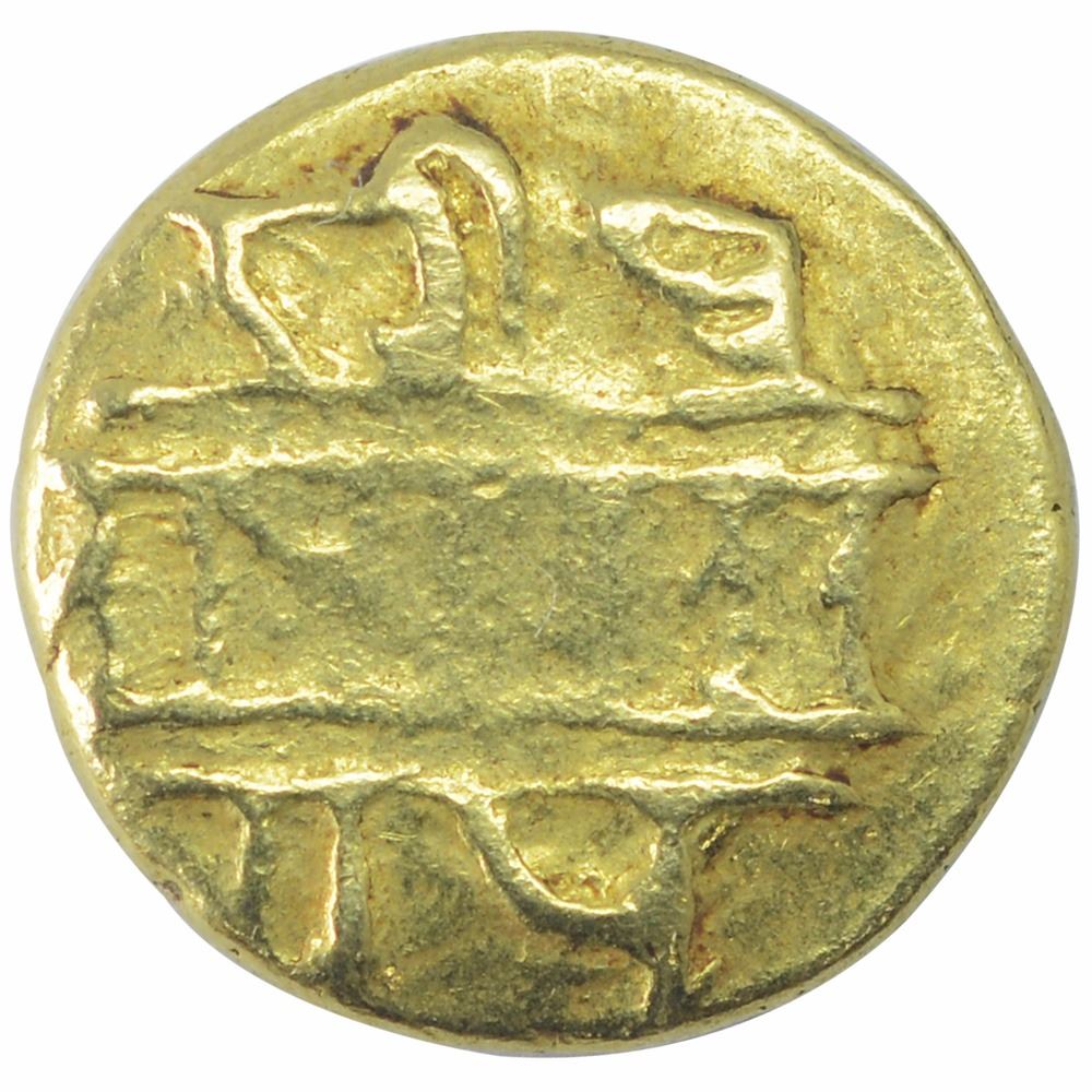 Vijayanagar Empire,Tuluva Dynasty,Achutharaya, Gold 1/2 Varaha, Obv: back view of gandaberunda or double headed eagle flying upward wearing ornaments, the wings and feathers are ornamented and the head has a crest, the huge bird is flying upwards carrying in each of its two beak and claws a fully grown tusker elephant, Rev: three line nagari legend with interlinear rules, sri pra/tapachyutha/raya, 1.71g, 10.42mm, (Dr.M.Girijapathi # 221), about extremely fine, Scarce.