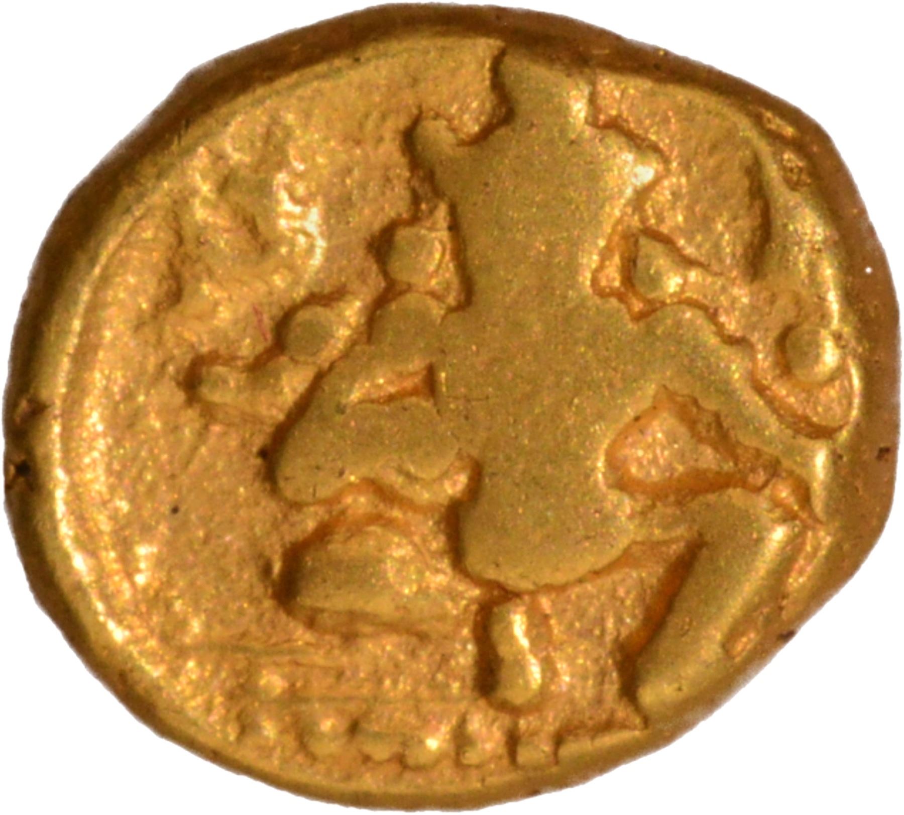 VijayanagarEmpire,TuluvaDynasty,Krishnadevaraya(1509-1529 CE),Gold 1/2 Varaha,Obv:Balakrishnaseated cross-legged, accosted by a conch-shell (right) and a discus(left),with his left hand resting on his left knee and his right hand holding a lump of butter,Rev:Nagari legendShripra/tapa Krishna/(raya)in three lines with two interlinear rules,1.68g, 10.4mm,(Mitch. KA # 644/Dr. M. Girijapathi # 161),about very fine,VeryScarce.