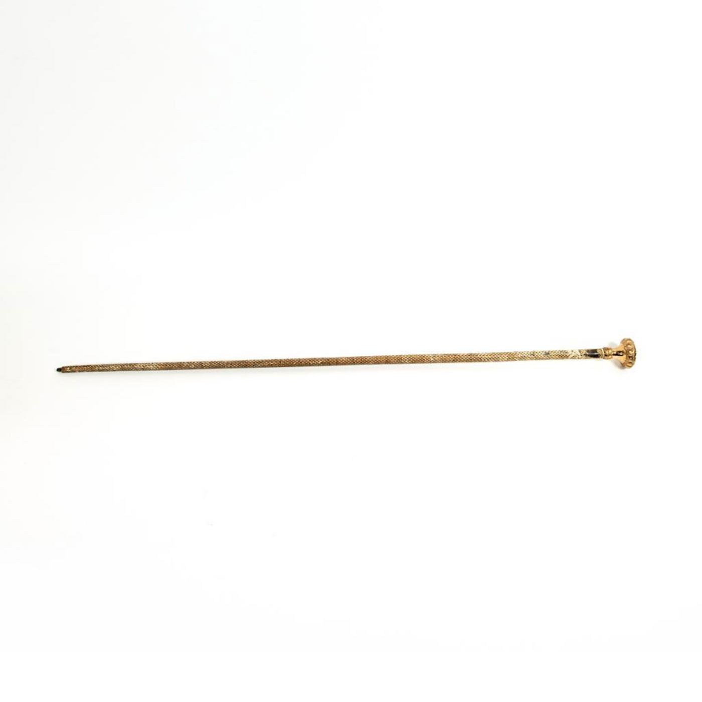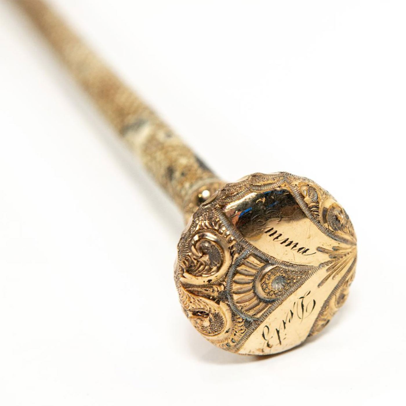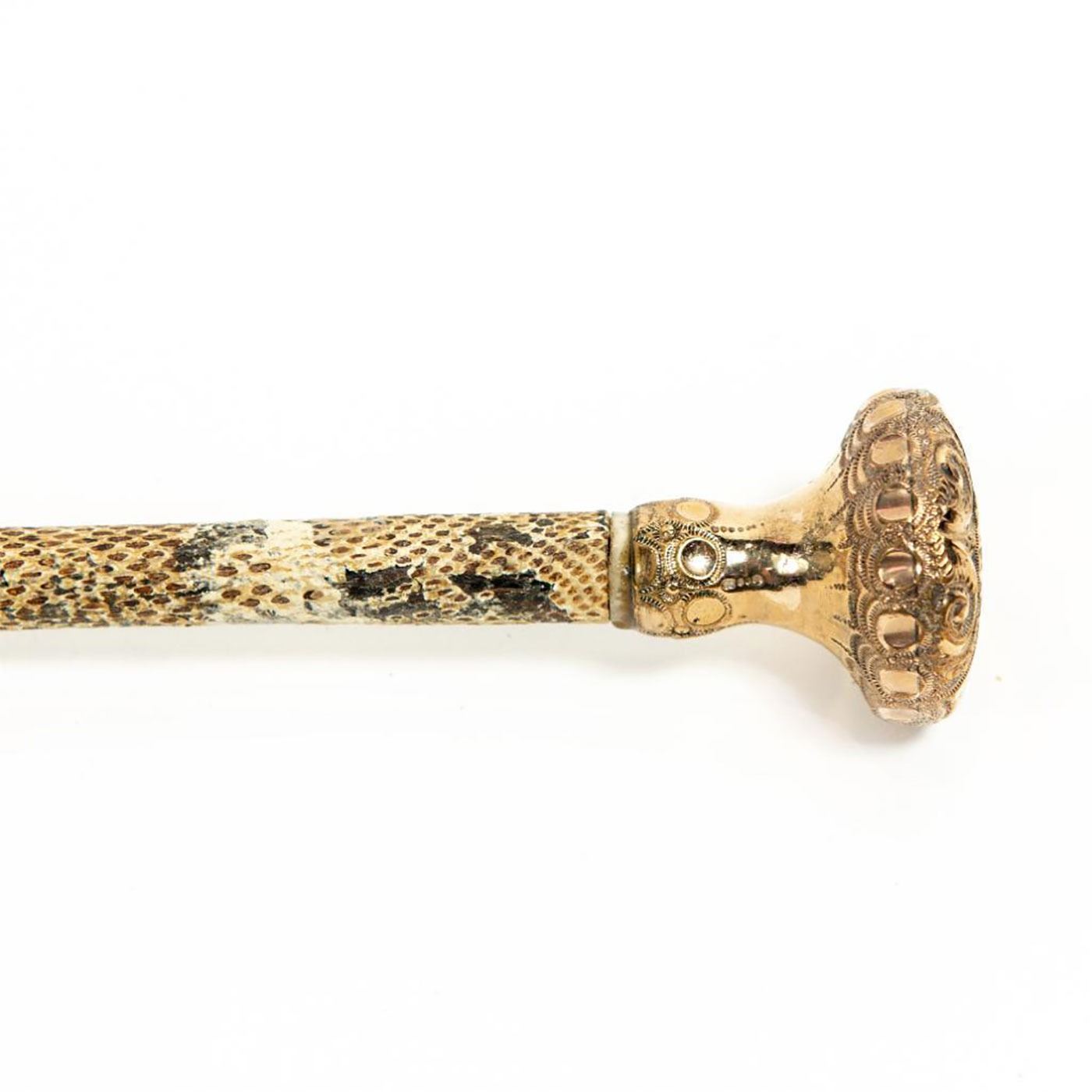 Solid Gold sheet over brass handle cane/walking stick 1850-1910. Presentation cane handles were made with a solid sheet of Gold over brass in repousse work which is metal punched from the reverse side to create the design on the metal and then soldered together in pieces to make a heavier weight. These gold sheet handles were primarily made in The United States. Marked "Emma Deitz". The shaft is stretched snake skin over wood and is 33.5"L. Excellent condition with age related wear. Fashion Canes and Walking Sticks