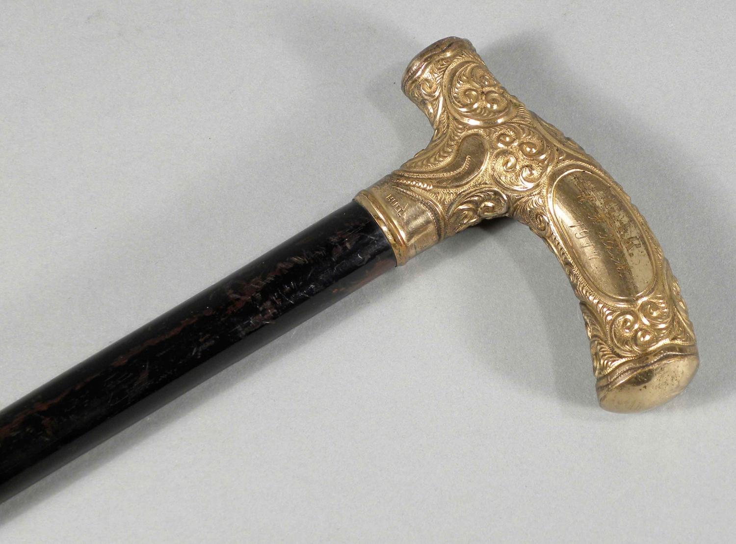 Gold Handled Man's Cane, inscribed GAR, 1917. Ebony shaft with steel tip. Dents in back of handle and wear to shaft otherwise good condition. 36 1/2 inches.