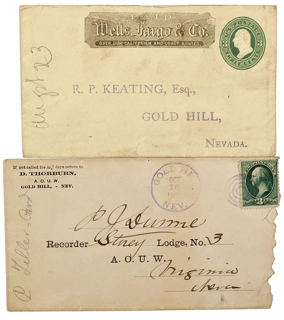 Lot of 2. 1). Wells, Fargo & Co. franked envelope addressed to R.P. Keating, Esq., Gold Hill, Nevada. Ca.1870-71. With 3 cent embossed indicium at upper right (U25). Ragged top. 2). Gold Hill Nevada cover with return address printed at upper left: "D. Thornburn, A.O.U.W." Includes one A46b cancelled postage stamp at upper right. Ragged right.