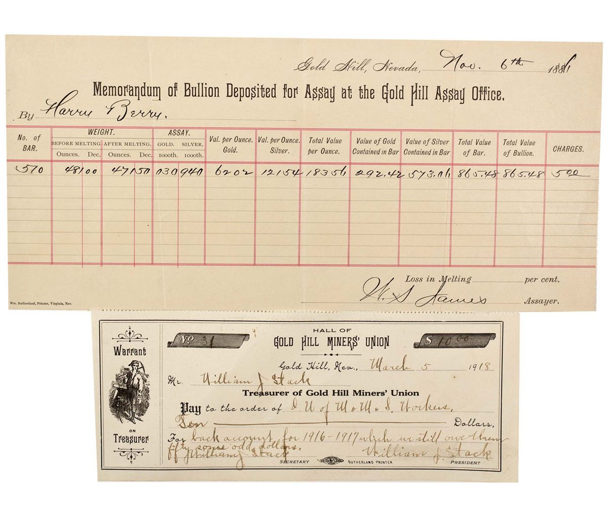 Lot of 2. 1). Memorandum of Bullion Deposit Assay from the Gold Hill Assay Office (1881) by Harry Berry. Signed by W.S. James. Total value of bullion: $865.48 ($292.42 in gold, and $573.06 in silver.) Three folds. 2). Gold Hill Miners' Union Warrant on Treasurer issued March 5, 1918 to I.U. of M.M.S Workers for $10. Handwritten at bottom: "For back account for 1916-1917 which we still owe them fifty some odd dollars." Signed by William J. Stack, president.