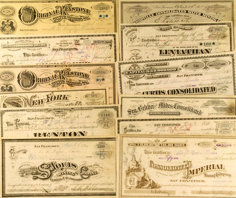 Lot of 13 pieces. This collection is of 12 different mines operating in the Gold Hill area during its peak production : 1) Original Keystone Silver Mining CO. Incorporated Aug 7, 1877. Comstock Ledge, Virginia NV. No. 2581 issued Apr. 15, 1881 for 3 shares. Signed R.E. Brewster. 2) Exchequer Mining Co. Incorporated July 19, 1865. No. 32273 issued Jan. 17, 1887 for 50 shares. Manuscript cancelled across face. Signed C. Hirschfield, Pres. 3) Original Keystone Silver Mining Co. No. 2618 issued nov. 1, 1892. Signed P.H. Kramer, Pres. 4) Woodville Cons. Silver Mining Co. Incorporated Jan. 14, 1875. No. 2849 issued Apr. 26, 1875 for 5 shares. Signed Robert S. Leonard, Pres. 5) Leviathan Mining Co. Incorporated Jan. 8, 1874. No. 7691 issued May 5, 1879 for 100 shares. Signed C.W.M. Smith. 6) Curtis Cons. Mining Co. Incorporated Sept. 1878. No. 749 issued March 2, 1880 for 100 shares. Signed Smith, Pres., H.S. Storie, Secr. 7) New York Mining Co. Incorporated June 4, 1874. No. 1571 issued Nov. 1, 1875 for 10 shares. Signed J.H. ?, Pres., H.C. Koebler, Secr. Vignette of Manhattan Island with ships. 8) Benton Cons. Co. Incorporated July 31, 1878. No. 6142 issued Oct. 26, 1880 for 100 shares. Signed Monroe Thomson, V-Pres., Watson, Secr. 9) Seg. Belcher & Mines Cons. Incorporated June 11, 1887. No. 6010 issued Jan. 16, 1891 for 5 shares. Signed Thomas Anderson, Pres. 10) St. Louis Mining Co. Incorporated May 26, 1876. No. 2289 issued Mar. 4, 1889 for 50 shares. Vignette of port with city and ships. Signed A.K.R. Shannon, Pres., D.C. Bates, Secr. 11) Consolidated New York Mining Co. Incorporated Nov. 23, 1887. No. 1840 issued ar. 7, 1892 for 20 shares. Signed by (?) Pres., Secr. Red manuscript cancel across face. Vignette of Statue of Liberty. 12) Consolidated Imperial Mining Co. Incorporated Apr. 13, 1876. No. 7844 issued June 28, 1898 for 50 shares. Signed James Newland, Pres. Br. On crème. 13) Consolidated Imperial Mining Co. No. 41054 issued Aug. 2, 1879 for 20 shares. Signed by (?) Pres., Secr. Blk on crème. Slight staining and slight wear to paper.
