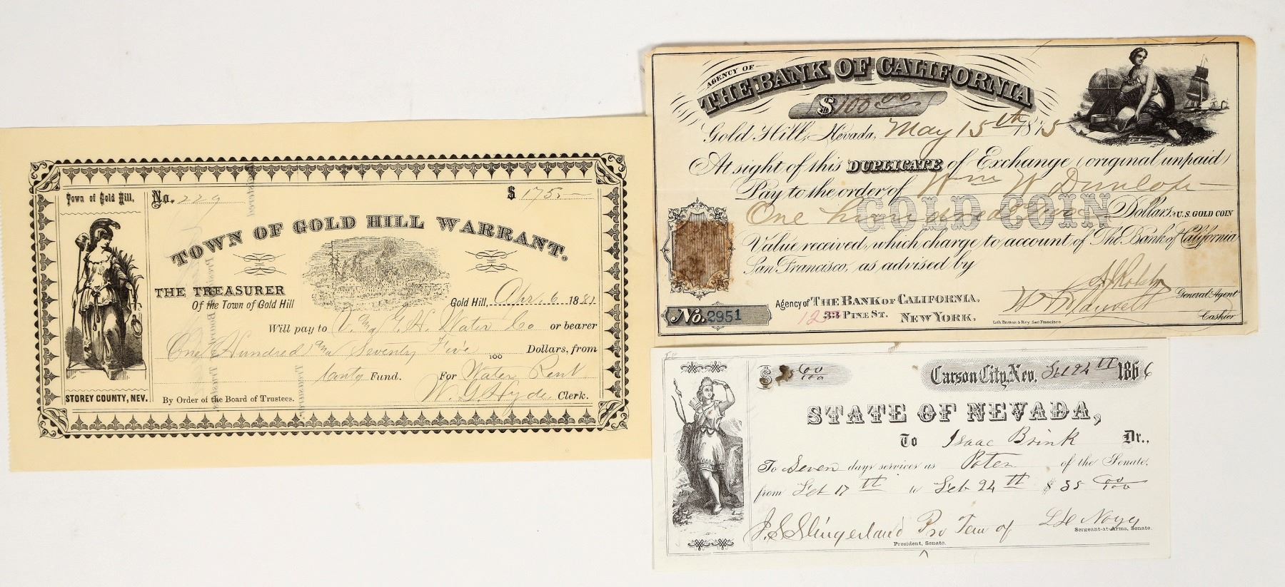Lot of 3. 1) Very rare Gold Hill Bank of California Duplicate of Exchange, 1875, to be paid in Gold Coin. Signed by AJ Ralston and Blauvelt. Issued to Wm. W. Dunlop. Stamp missing; stain. 2) Town of Gold Hill warrant, 1881 to the Virginia & Gold Hill Water Co. for water rent. 3) 1866 State of Nevada warrant to Isaac Brink for services as porter in the Senate.