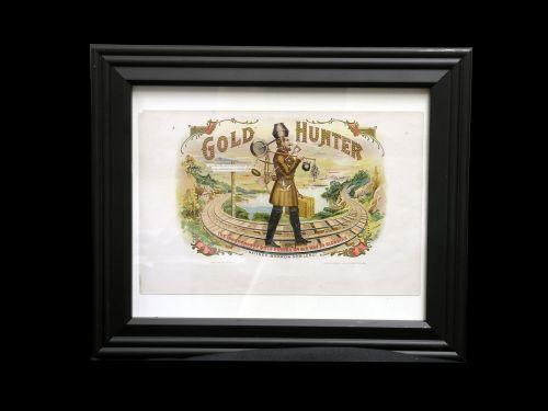 Gold Hunter Cigar Box Label, c.1898 The Independent Gold Hunter on his way to the Klondike. Embossed gold and 4 color Litho by Geo Schlegel, NY 6" x 9"