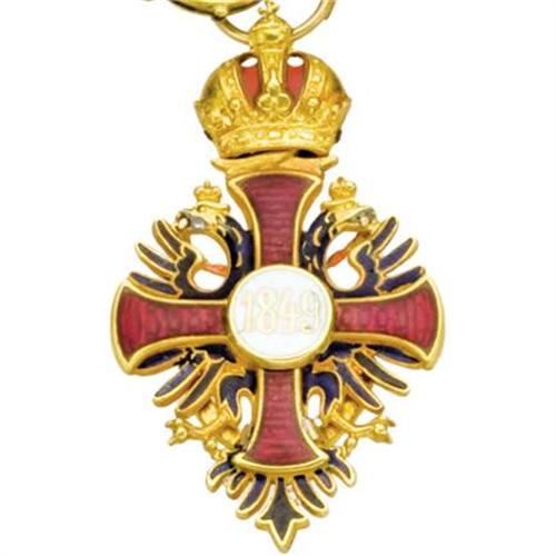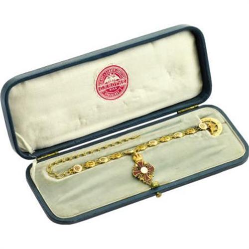 <B>Fine Franz Josef Miniature Gold Enameled Imperial Collar Formed as a Bracelet</B></I><BR><I>Viennese, circa 1849</B></I><BR><BR>Designed as the Grand Cross in white and red enamel, centered on the initials <I>FJ</B></I>, for Franz-Josef, Emperor of Austria (r. 1848-1916), King of Hungary (r. 1867-1916), the reverse in white enamel with date <I>1849</B></I> in gold, suspended from a gold link bracelet decorated with eleven alternating enameled circular links, these links decorated either with red initials <I>FJ </B></I>on polished gold, or with gold Habsburg crowns on white ground, enameled on both sides, attached at one end to a gold replica of the star of the order with suspension hook, the reverse engraved<I> VIRIBUS UNITIS</B></I> (by joint effort)<I>, </B></I>the other end with oval link chain-8 1/4 in long, in original fitted gray leather presentation box stamped <I>C.F. ROTHE K.K. HOF u. KAMMER-JUWELIER, KOHLMARKT I WIEN<BR><BR>Franz Josef (1830-1916)</B></I><BR><BR>One of Europe's longest reigning monarchs, Franz-Joseph was Emperor of Austria, Apostolic King of Hungary, and King of Bohemia from 1848 to 1916. His lengthy rule was marked by tragedy, including a loveless marriage, the suicide and murder of two heirs, and the empire's entry into a disastrous war. His dynasty, the House of Habsburg, survived his death by two years and was replaced by a republic at the end of the First World War, in 1918.<BR><BR>Provenance:<BR>Probably made to commemorate the Coronation of Emperor Franz-Joseph of Austria. <BR>Purchased from Bathgate Ltd., London<BR><BR><BR><b>Shipping:</b> Requires 3rd Party Shipping (<a target="_blank" href="http://www.heritageauctions.com/common/shipping.php">view shipping information</a>)