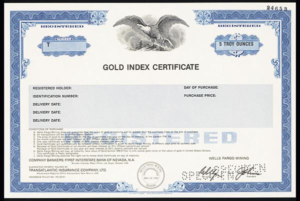 Gold Index Cert, ND, Specimen Stock.