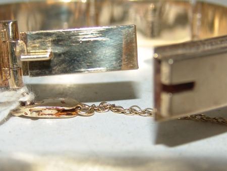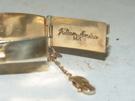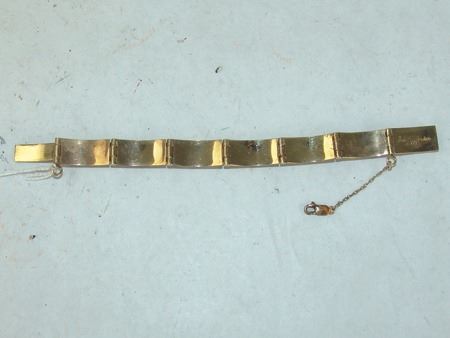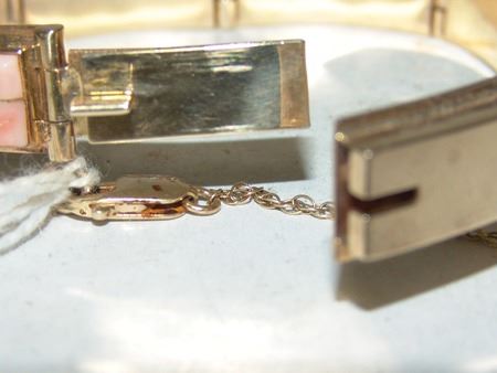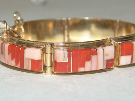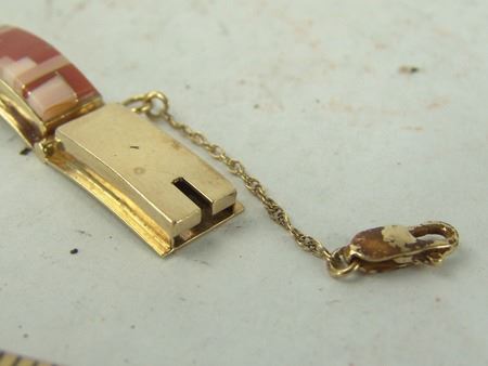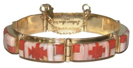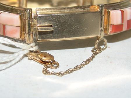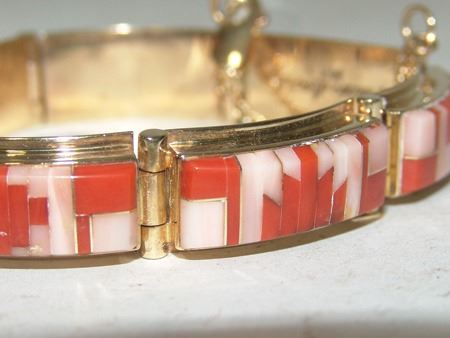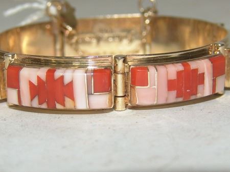 Late 1900s, Beautiful 14kt gold segment bracelet with safety chain, and mosaic inlays of coral and shell. Very good condition. Total weight 1.185ozT. 6-1/2" x 1/2" x 1/4"
