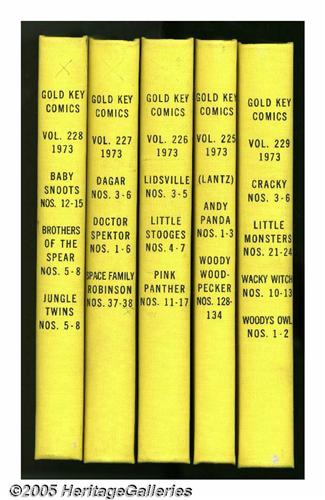 <B>Gold Key Bronze Age Bound Volumes (Gold Key, 1973).</B></I> These are Gold Key file copies which were trimmed and bound into five volumes. The comics were obviously in Near Mint condition when bound and still in superb condition today. The comics included here are <B>Baby Snoots</B></I> #12-15, <B>Brothers of the Spear</B></I> #5-8, <B>Jungle Twins</B></I> #5-8, <B>The Wacky Adventures of Cracky</B></I> #3-6, <B>Little Monsters</B></I> #21-24, <B>Wacky Witch</B></I> #10-13, <B>Woodsy Owl</B></I> #1-2, <B>Dagar</B></I> #3-6, <B>The Occult Files of Doctor Spektor</B></I> #1-6, <B>Space Family Robinson</B></I> #37-38, <B>Lidsville</B></I> #3-5, <B>Little Stooges</B></I> #4-7, <B>Pink Panther</B></I> #11-17, <B>Walter Lantz Andy Panda</B></I> #1-3, and <B>Woody Woodpecker</B></I> #128-134. Approximate Overstreet VG 4.0 value for group = $250. <I>From the Random House Archives.</B></I>