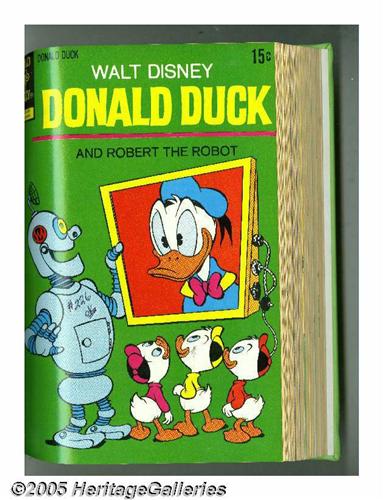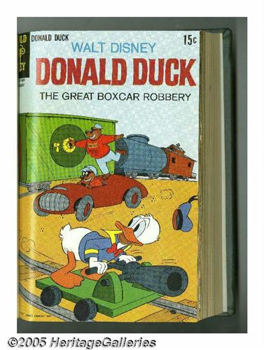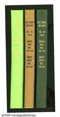 <B>Gold Key Disney Comics Bound Volumes (Gold Key, 1969-72).</B></I> Three sturdy bound volumes, all containing <B>Donald Duck</B></I> and <B>Mickey Mouse</B></I> comics, are featured in this lot. Volume 18 contains <B>Donald Duck</B></I> #122-128 and <B>Mickey Mouse</B></I> #120-123. Volume 19 includes <B>Donald Duck</B></I> #129-134 and <B>Mickey Mouse</B></I> #124-127. Finally, Volume #12 has <B>Donald Duck</B></I> #141-147 and <B>Mickey Mouse</B></I> #134-140. While most of these stories were new at the time by artists like Tony Strobl, there are some reprints featuring art by Carl Barks and Al Taliaferro mixed in. These were Western Publishing file copies, bound and trimmed into books for office use; many comics still look new, while a number have hand-written notes or taped-in typed instructions concerning stories to be reprinted in later editions. Overstreet 2005 VG 4.0 value for group = $208. <I>From the Random House Archives.</B></I>