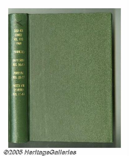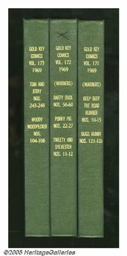 <B>Gold Key Miscellaneous Titles Bound Volumes (Gold Key, 1969).</B></I> These are Western Publishing file copies which have been trimmed and bound into three hardcover volumes. Included here are <B>Beep Beep The Road Runner</B></I> #10-15, <B>Bugs Bunny</B></I> #121-126, <B>Daffy Duck</B></I> #56-60, <B>Porky Pig</B></I> (second series) #22-27, <B>Tom and Jerry</B></I> #243-248, <B>Tweety and Sylvester</B></I> #11-12, and <B>Woody Woodpecker</B></I> #104-108. Approximate Overstreet VG 4.0 value for group = $150. <I>From the Random House Archives.</B></I>