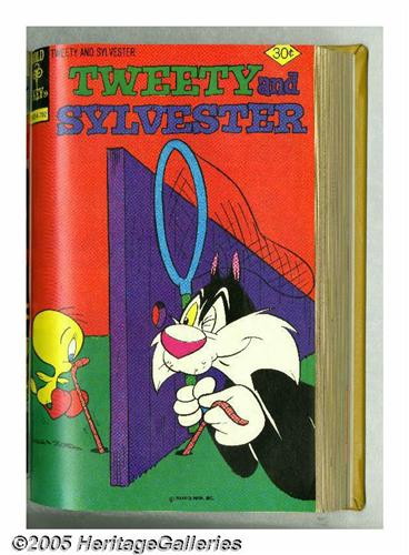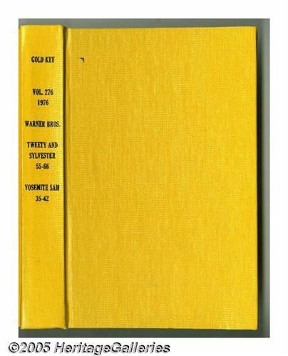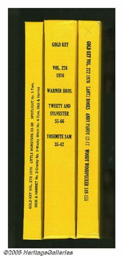 <B>Gold Key Miscellaneous Titles Bound Volumes (Gold Key, 1976).</B></I> If these comics hadn't been bound and trimmed into hardback volumes, they would grade out pretty darn high! The colors of the covers alone will knock you out! These three matching volumes represent some of Gold Key's output during the bicentennial year 1976. Vol. 276 features Warner Brothers titles, including <B>Tweety and Sylvester</B></I> #55-66 and <B>Yosemite Sam</B></I> #35-42. Vol. 272 features Walter Lantz titles: <B>Andy Panda</B></I> #12-17, and <B>Woody Woodpecker</B></I> #149-155. Vol. 278 is a mixed bag that includes <B>Little Monsters</B></I> #33-38, plus the first four issues of <B>Gold Key Spotlight</B></I> -- #1 (<B>Tom, Dick and Harriet</B></I>); #2 (<B>Cracky</B></I>); #3 (<B>Wacky Witch</B></I>) and #4 (<B>Tom, Dick and Harriet</B></I>). All comics were Western Publishing file copies; while some books have handwritten notes pertaining to later reprints; most are like new. Approximate Overstreet VG 4.0 value for group = $150. <I>From the Random House Archives.</B></I>