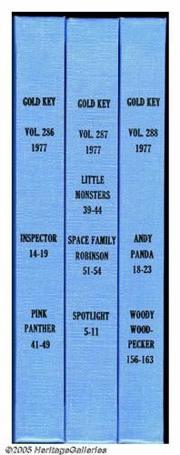 <B>Gold Key Miscellaneous Titles Bound Volumes (Gold Key, 1977).</B></I> Here are some great-looking Gold Key file copies, which have been trimmed and bound into three hardcover volumes for your reading pleasure. The titles included here are <B>Walter Lantz Andy Panda</B></I> #18-23, <B>Gold Key Spotlight</B></I> #5-11, <B>The Inspector</B></I> #14-19, <B>Little Monsters</B></I> #39-44, <B>Pink Panther</B></I> #41-49, <B>Space Family Robinson</B></I> #51-54, and <B>Woody Woodpecker</B></I> #156-163. Approximate Overstreet VG 4.0 value for group = $150. <I>From the Random House Archives.</B></I>