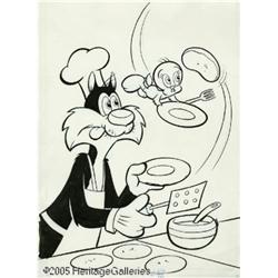 <B>Gold Key Studios - Tweety & Sylvester #40 Cover Original Art (Gold Key, 1974).</B></I> Love the smell of flapjacks in the morning? Then you'll flip over this breakfast bonanza featuring Sylvester and Tweety in a culinary confrontation over a high-flying griddle cake. The art measures 11" x 15," and even with two small areas where the white-out has chipped off, the work is in Excellent condition.