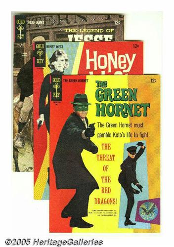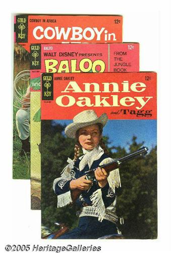 <B>Gold Key TV and Movie Comics File Copies Group (Gold Key, 1962-68) Condition: Average FN/VF.</B></I> This full short box includes the following comics: <B>Annie Oakley and Tagg</B></I> #1 (two copies), <B>Baloo and Little Britches</B></I> #1 (two copies), <B>Cowboy in Africa</B></I> #1 (13 copies, average VF/NM), <B>Green Hornet</B></I> #1-3 (average VF/NM), <B>Honey West</B></I> #1, <B>I Spy</B></I> #3 (six copies), <B>Krazy Kat</B></I> #1 (VG), <B>Legend of Jesse James</B></I> , <B>Land of The Giants</B></I> #1 (VG), <B>King Louie and Mowgli</B></I> #1 (two copies), <B>Mister Ed</B></I> #1 (three copies, average VF/NM), #2 (VG), #3 (VG), and #5 (eight copies, average VF/NM); <B>National Velvet</B></I> #1 and 2 (two copies of each); <B>My Favorite Martian</B></I> #4 (VF/NM), #5 (two copies) and #9 (VF/NM); <B>The Nurses</B></I> #2 (two copies) and #3 (two copies); <B>Secret Agent</B></I> #2, <B>77 Sunset Strip</B></I> #1 and two copies of #2, <B>Space Mouse</B></I> #3-5 (two copies of each); <B>Time Tunnel</B></I> #1 (seven copies) and #2 (four copies); and <B>Walt Disney Showcase</B></I> #26 (four copies), as well as the following <B>Movie Comics</B></I>: <B>The Horse Without a Head</B></I>, <B>The Jungle Book</B></I> #1 (two copies, VF/NM), <B>Kidnapped</B></I> (two copies), <B>Merlin Jones as the Monkey's Uncle</B></I> (two copies), <B>Lady and the Tramp</B></I> #10042-301 (two copies) and #2 (two copies), <B>Lt. Robinson Crusoe</B></I> #1 (5 copies), <B>The Love Bug</B></I> (two copies), <B>Mary Poppins</B></I> #10136-501 (two copies) and 30023-501, and <B>The Misadventures of Merlin Jones</B></I> (two copies). There are also four Dells in the group: two copies of <B>Four Color</B></I> #1101 (Kidnapped) and two copies of <B>Four Color</B></I> #1136 (Jungle Cat). Approximate Overstreet value for group = $4,100. <I>From the Random House Archives.</B></I>