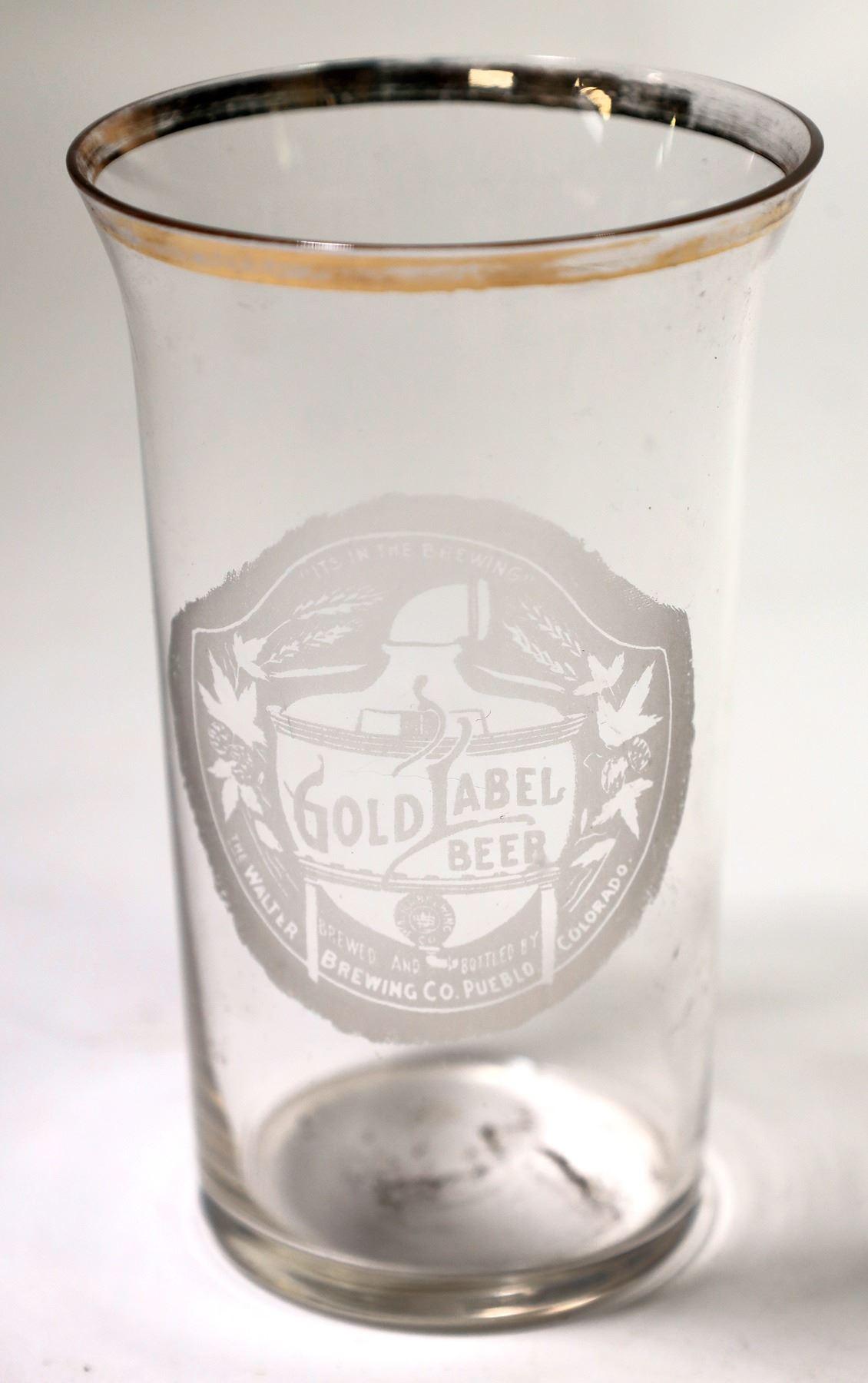 Stenciled beer glass. "Its In The Brewing"/Gold Label Beer/Walter Brewing Co./Brewed and Bottled By/ The Walter Brewing Co. Pueblo, CO. Partial gold around rim. No apparent chips or cracks. 4.5x2.75".