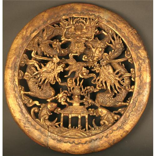 Chinese Qing Dynasty Opera House Window. Gold lacquered wood sculpture. This round shape has a spectacular and powerful presence. It features Dragons, a Mighty Deity, and auspicious figures. This elaborate work of art was part of a Grand Chinese Opera House. Diameter: 19 inches, 48 cm. Very Good Condition. From a prominent and widely exhibited collection.
