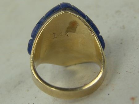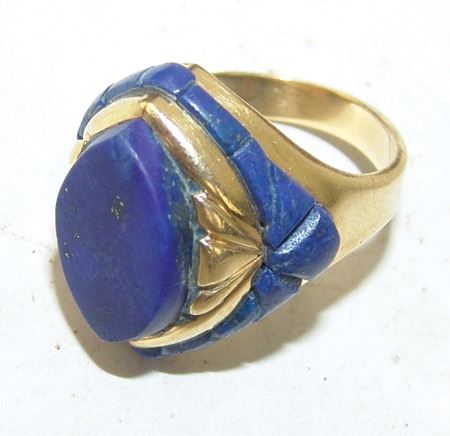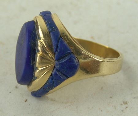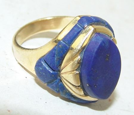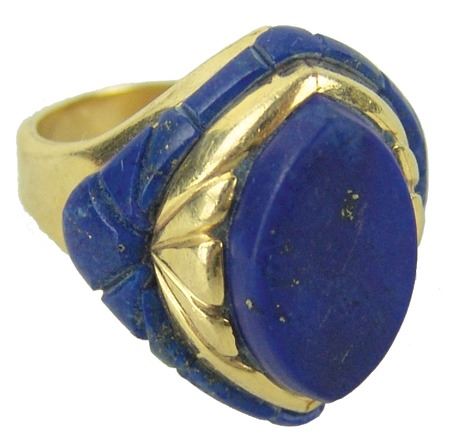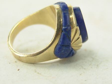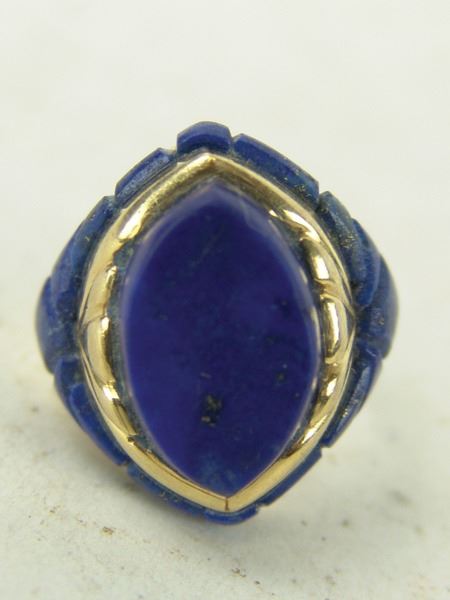 Ca. 1996, Fine contemporary design 14kt gold ring set with carved and polished deep blue lapis lazule stones; net wt 0.3 ozT. Very good condition. Size 5-1/2, 0.3ozT