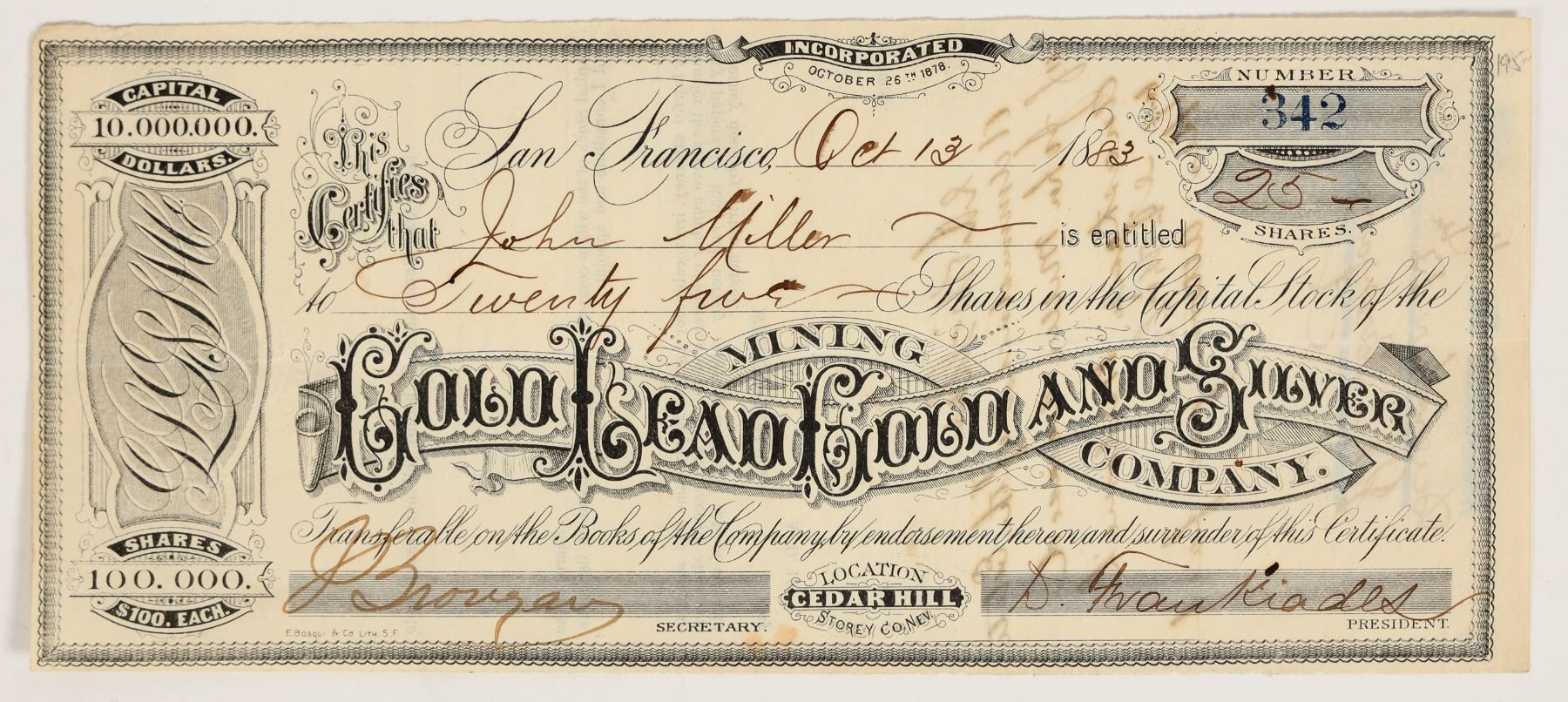 Location Cedar Hill, Storey Co., Nev (printed at bottom center). Inc. Oct. 1878. No. 342, issued for 25 shares to John Miller on Oct. 13th, 1883 in San Francisco. Signed by president D. Frankiades and secretary J. Bronzan. Not cancelled. Black border and print, fancy scrollwork title. Printed by E. Bosqui & Co. SF. 4 x 9" Folds, toning. No information located on this company. Cedar Hill is located at the north end of the Comstock Lode.