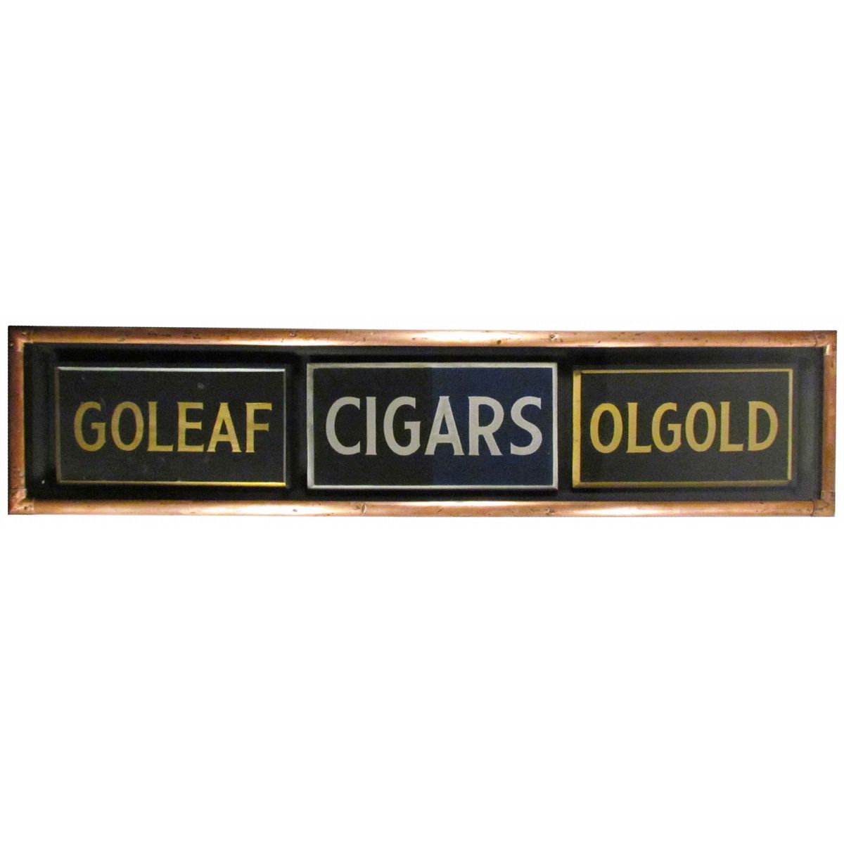 Gold Leaf-Old gold Cigars Shadow Box Sign. 3 Separate wood signs in copper framed shadow box. Very good condition. 50 X 11 X 3 1/4 inches.