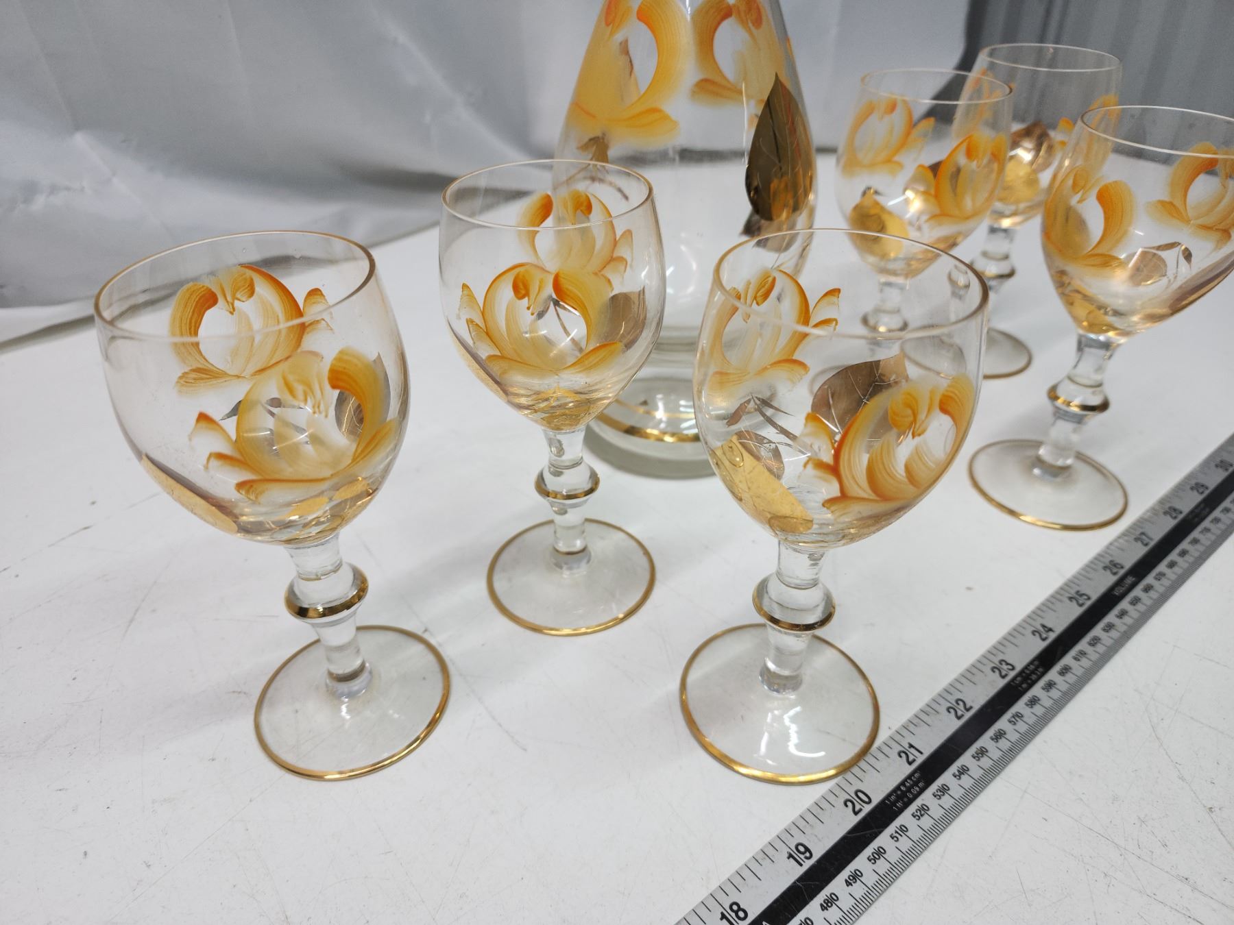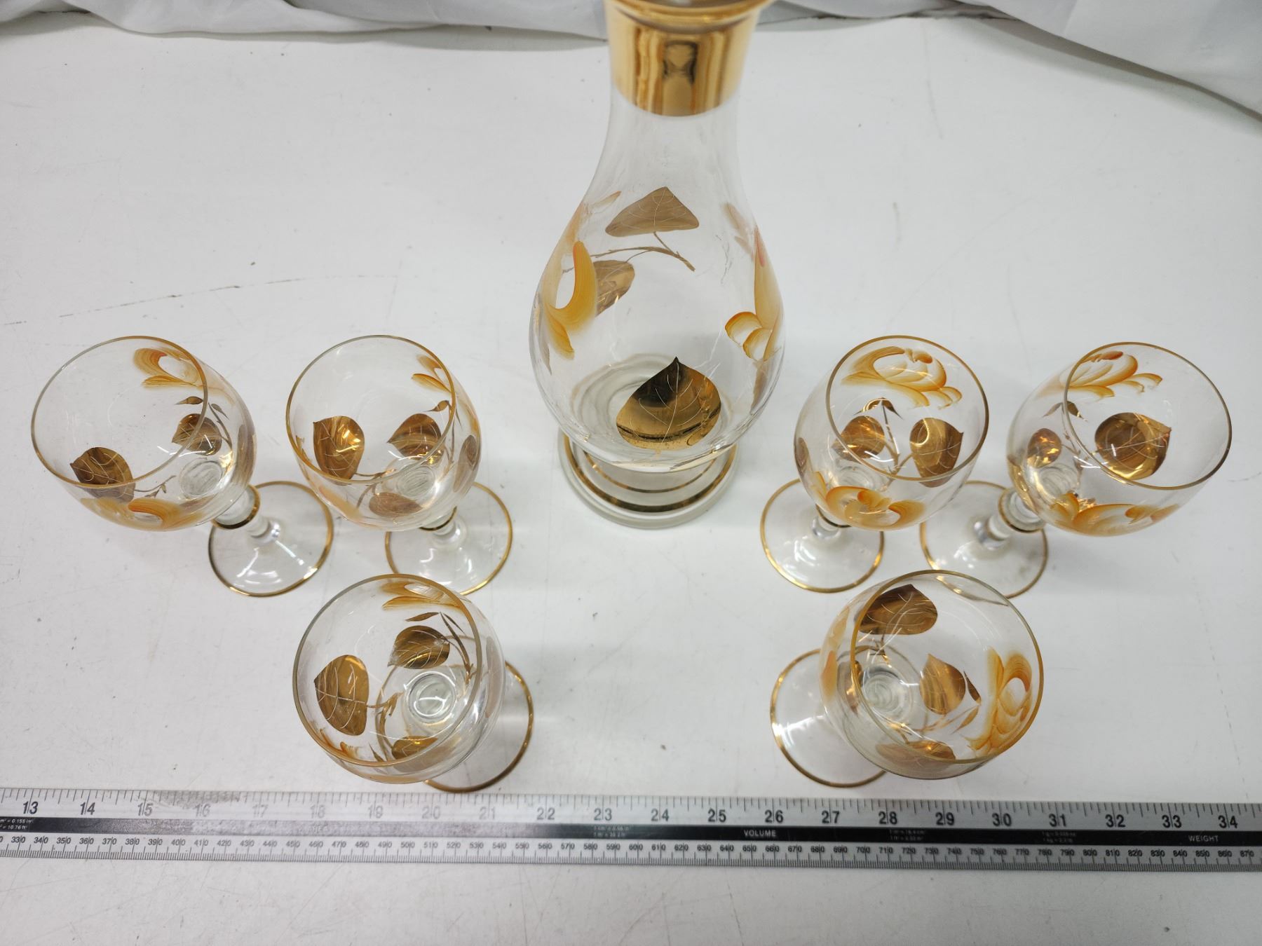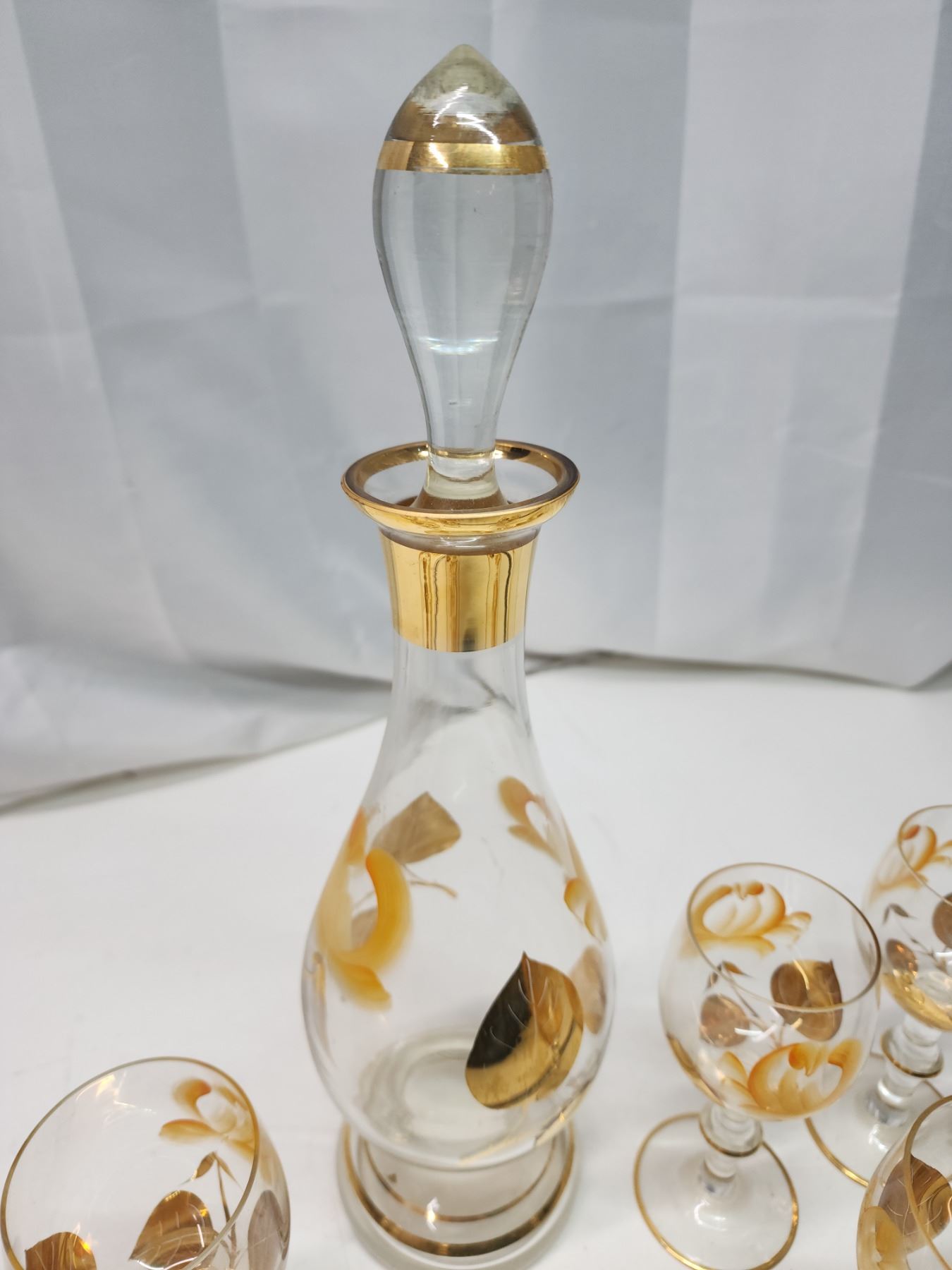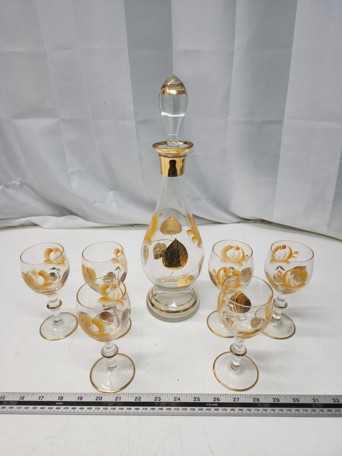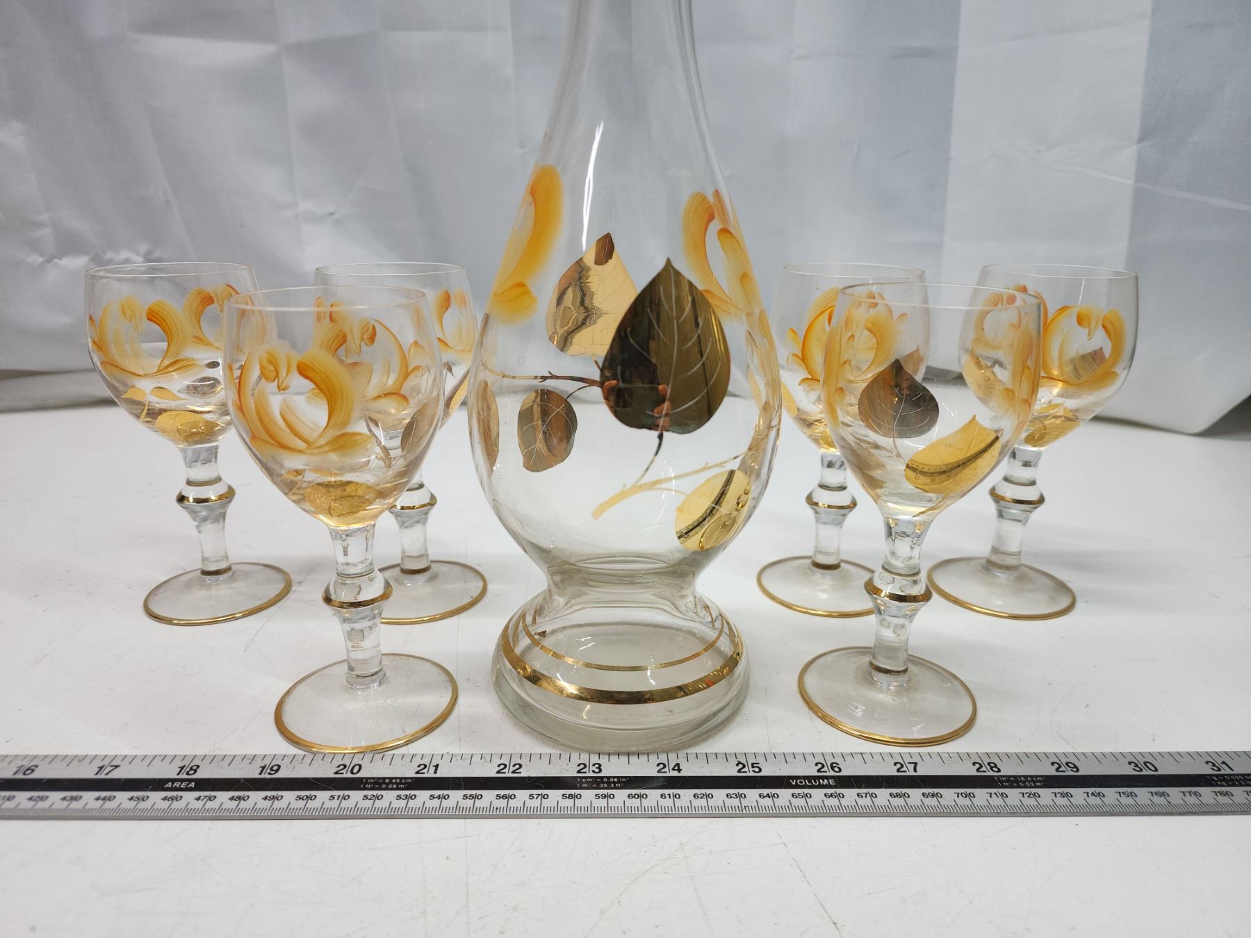 Gold Leaf accented, glass decanter set - c/w 6 wine glasses