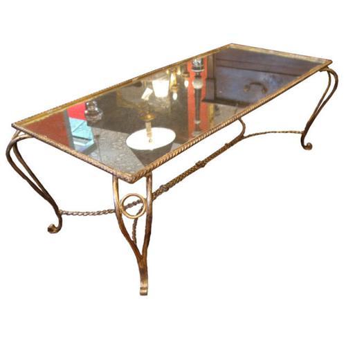 This beautiful coffee table is made of gold leafed iron with an eglomized glass top.