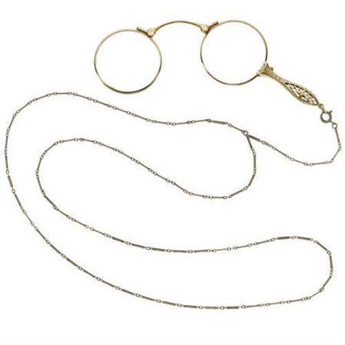 <B>Gold Lorgnette</B></I><BR><BR>The hinged and spring loaded lorgnette opens to reveal two circular-shaped spectacles, supported by an open framework 14k yellow gold handle. The lorgnette is suspended by a delicate 10k white gold chain. Gross weight 27.70 grams.<BR>Chain Length: 34 inches. Lorngette Dimensions: 3-1/2 inches x 1-3/4 inches<BR><BR> <B>Condition Report:</B> Good condition.<BR><BR><b>Shipping:</b> Miscellaneous Collectibles, Smal (<a target="_blank" href="http://www.heritageauctions.com/common/shipping.php">view shipping information</a>\)