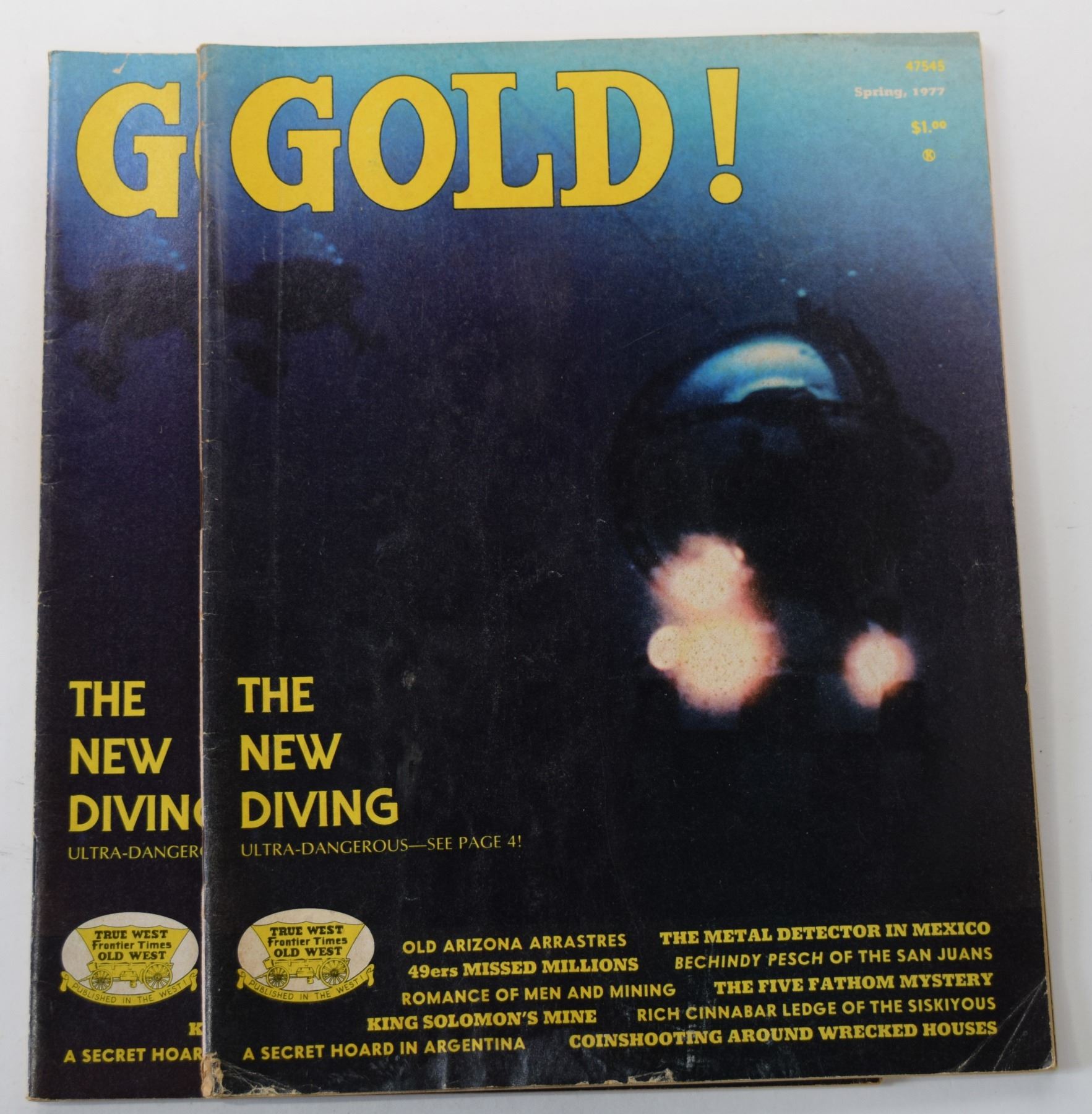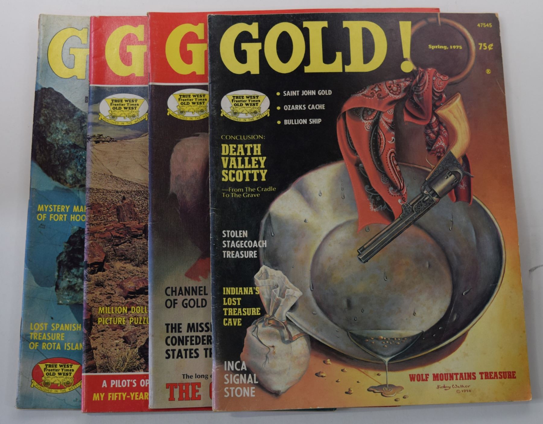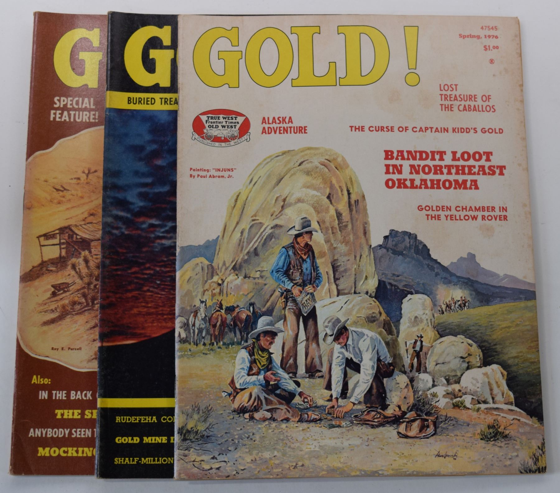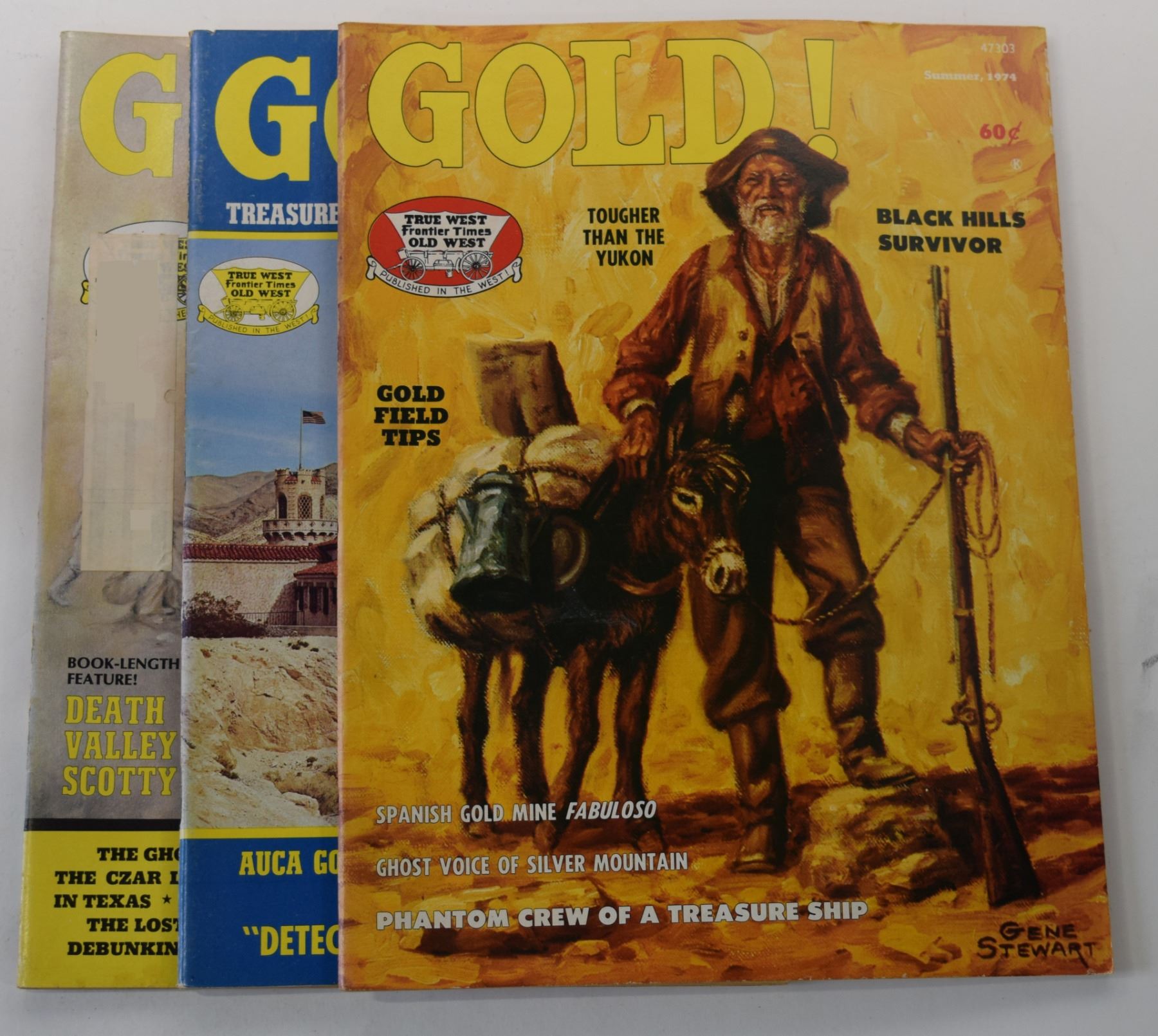 This lot contains issues of the popular treasure hunting magazine: Gold! for the year(s) 1969 through 1977. This rare magazine was published by Western Publications starting in 1969, as an annual publication and then went to quarterly sometime shortly after 1971. It was published until 1977. The same publisher published True West, Old West and Frontier Times. Issues included in this lot: