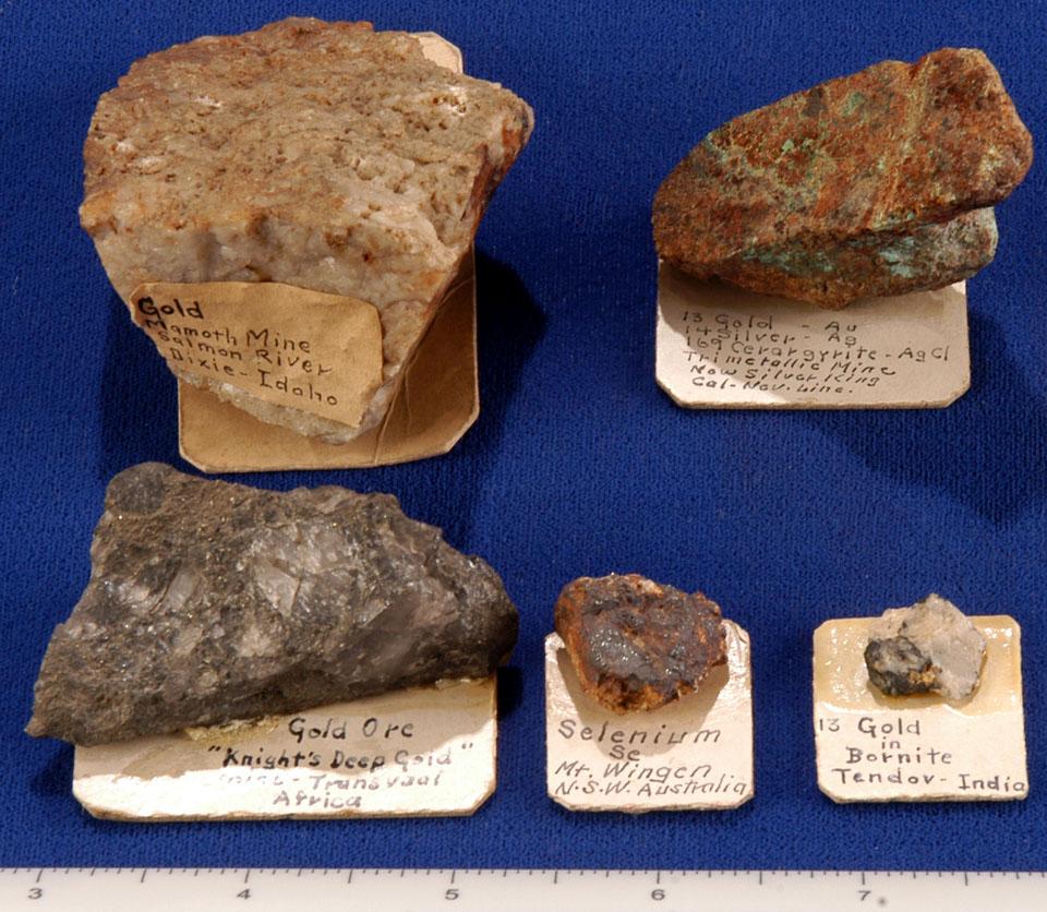 Lot of 5 gold bearing ore specimens from various worldwide locations. Samples range from 1/4 in to 2 inches in daimater and consist of gold within massive bull quartz vein from the Mamoth Mine, Salmon River area, Dixie, ID; native gold on bornite from Tendor, India; gold and silver in cerargyrite from the Trimetallic Mine (later renamed the Silver King), NV-CA state line; gold ore from the Knights Deep Gold Mine, Transvaal, Africa, and native selenium from Mt. Wingon, NSW, Australia.