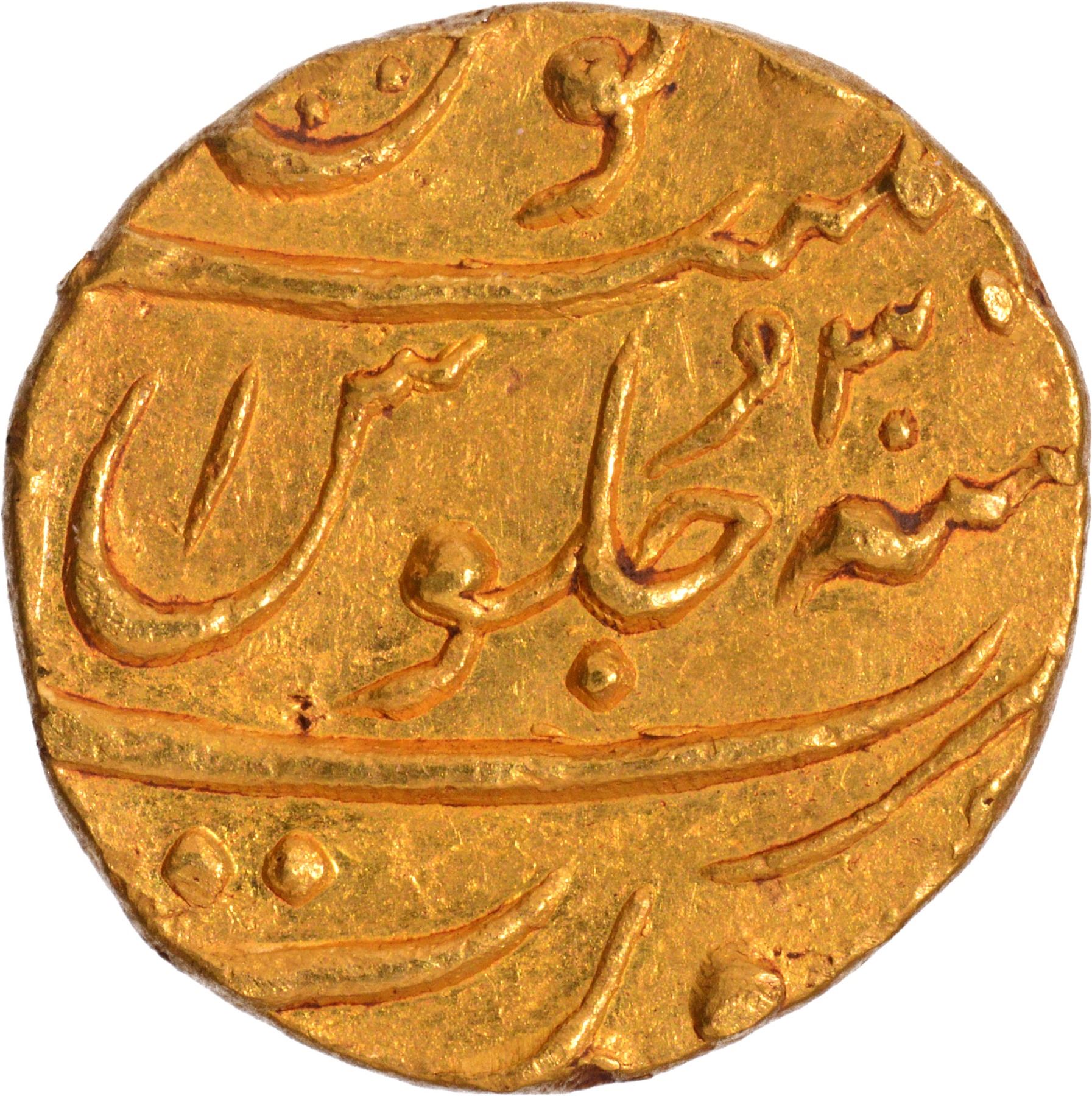 Aurangzeb Alamgir(AH 1068-1118/1658-1707 AD), Surat Mint, Alif Type, Gold Mohur, AH1097 /30 RY,Mihr Munir Couplet,Obv: Persian legend sikka zad dar jahan chu mihr e munir Badshah Aurangzeb Alamgir,Rev: Persian legendsana 30 julus zarb Surat at bottom, letter alif in Persian seen, 11.1g, 21.79mm, (Unlisted Type in KM), almost uncirculated,Very Rare.
