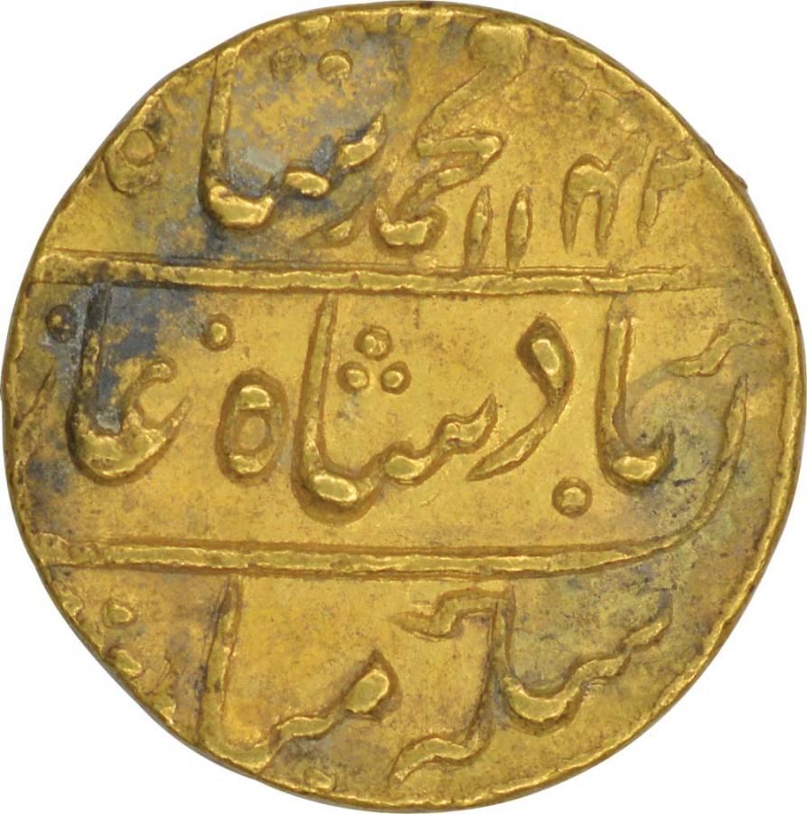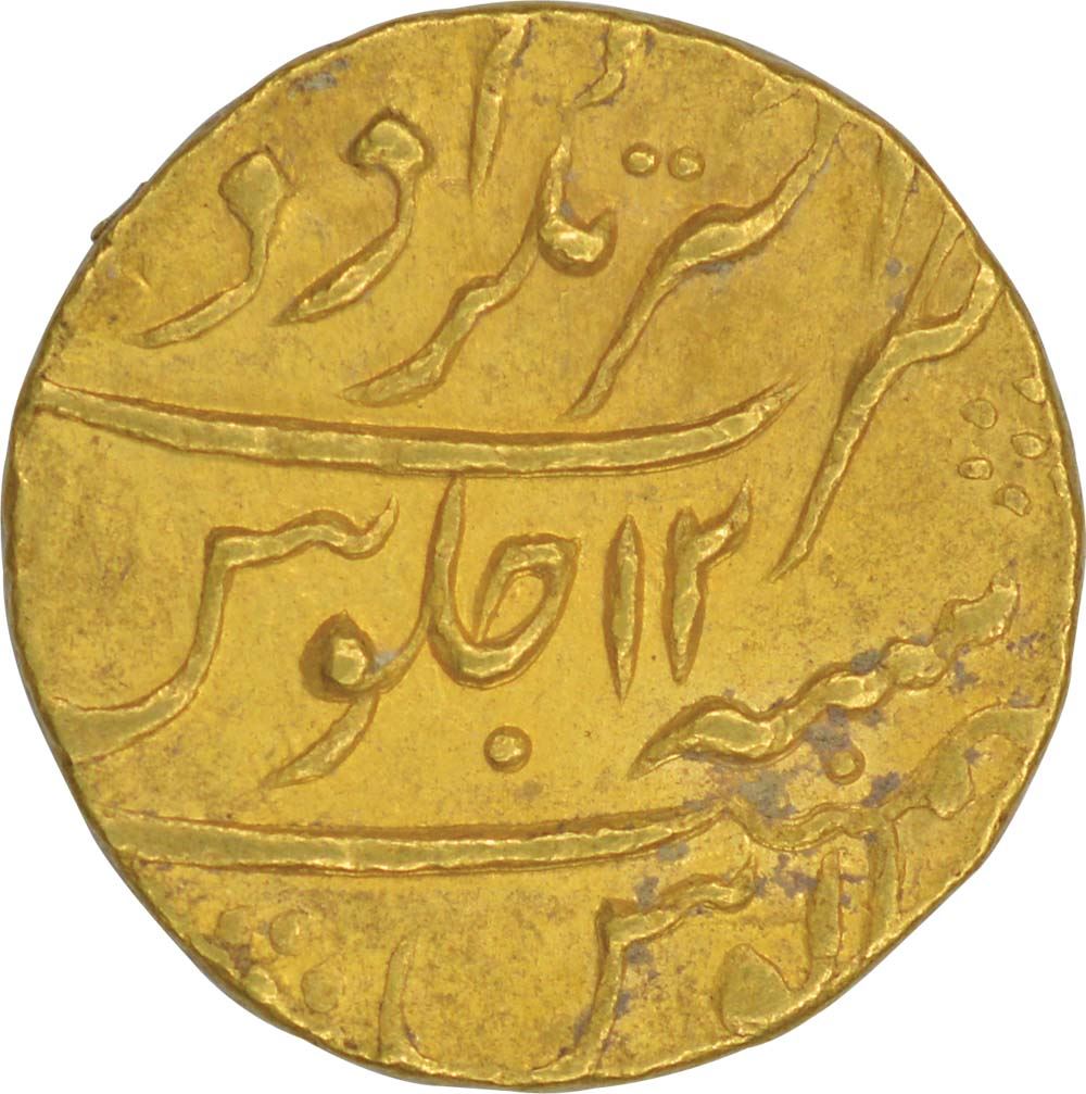 Muhammad Shah, Akhtarnagar Awadh, Gold Mohur, AH 1142/12 RY, Obv: sikka mubarak badshah ghazi, Rev: sana julus zarb, 10.95g, 20.20mm, AH year RY Unlisted Type, about extremely fine, Extremely Rare.