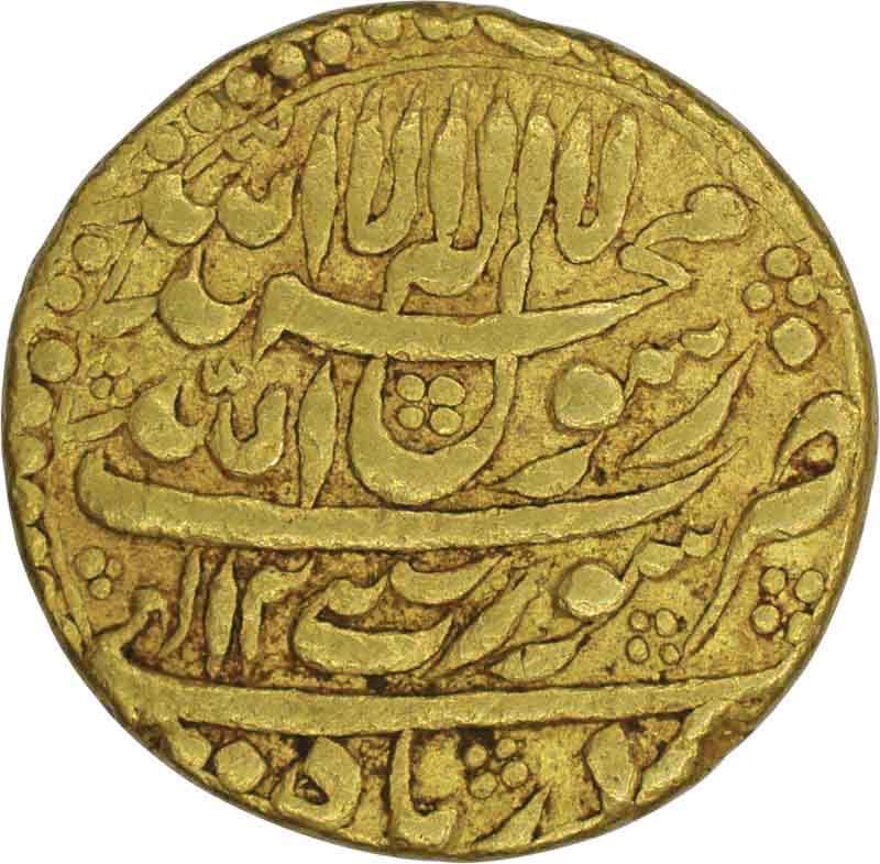 Shah Jahan, Surat, Gold Mohur , 2RY,Azar Month,Obv: kalima shahada, at bottom zarb month, Rev: "saheb-e-giran sani" badshah ghazi,11.0g, 22.02mm,(KM # 255.6), about extremely fine, Scarce.