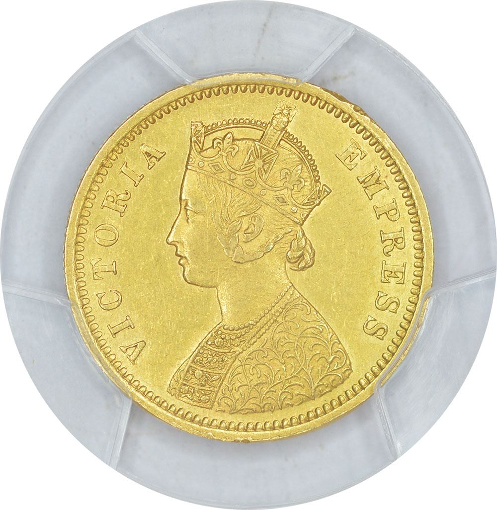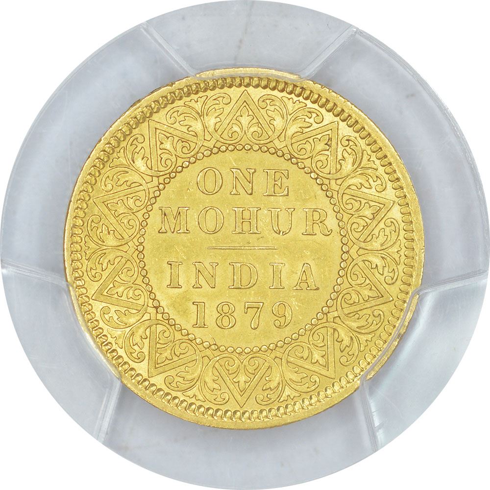 1879, Victoria Empress, Gold Mohur, Calcutta Mint, "V" on ground-Line of bust, Calcutta Mint Privy mark "C" in relief below the beaded circle under the date, (PR # 17), graded slabbed by PCGS as AU58. Rare.