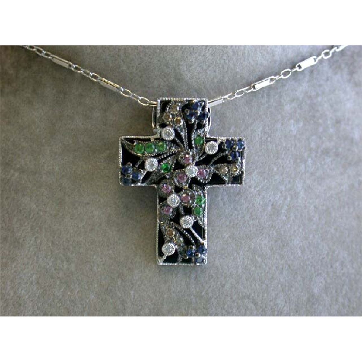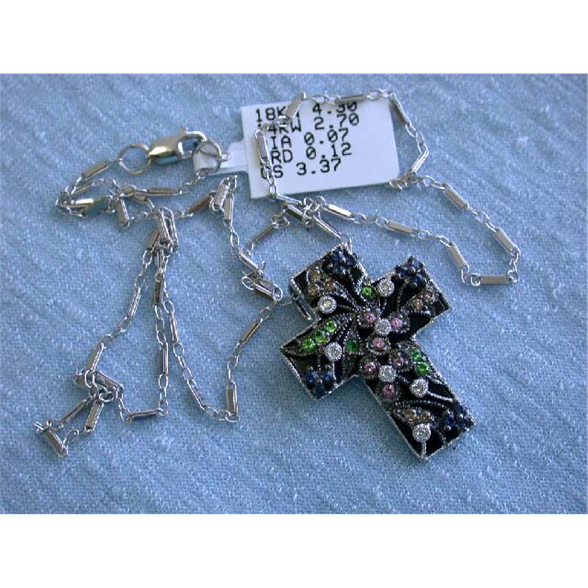White Gold Cross Necklace. The Pendant is an 18k White Gold w/ 0.07 carat Diamonds in G color and VS clarity and 0.12 carat Brown Round Diamonds and 3.37 carats Sapphire and the size of this is 1 inch X 3/4 inch and weighs 4.30 grams. The Chain length is 17.5 inches long and weighs 2.70 grams.