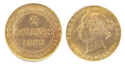 Gold Nfld 1888 $2 PCGS MS63. Attractive with lots of lustre.