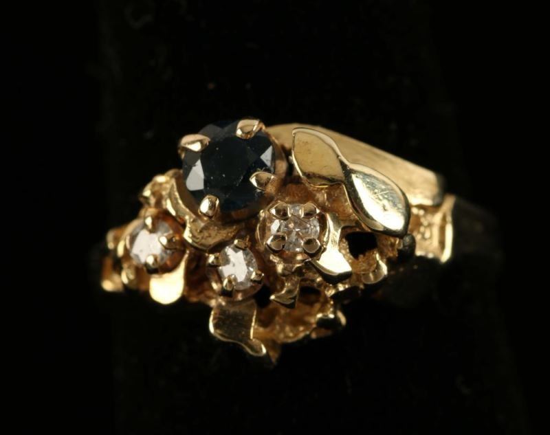 14K gold nugget is set with a round sapphire with three small round diamonds. Size 5. Very unique.