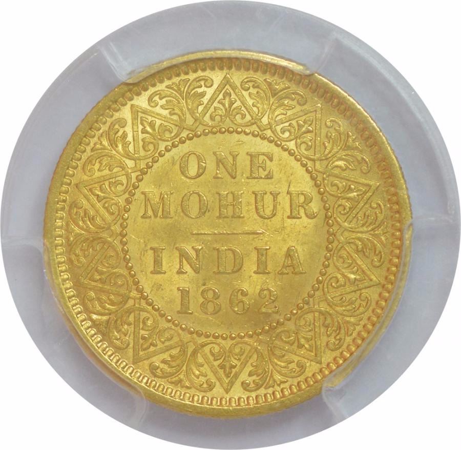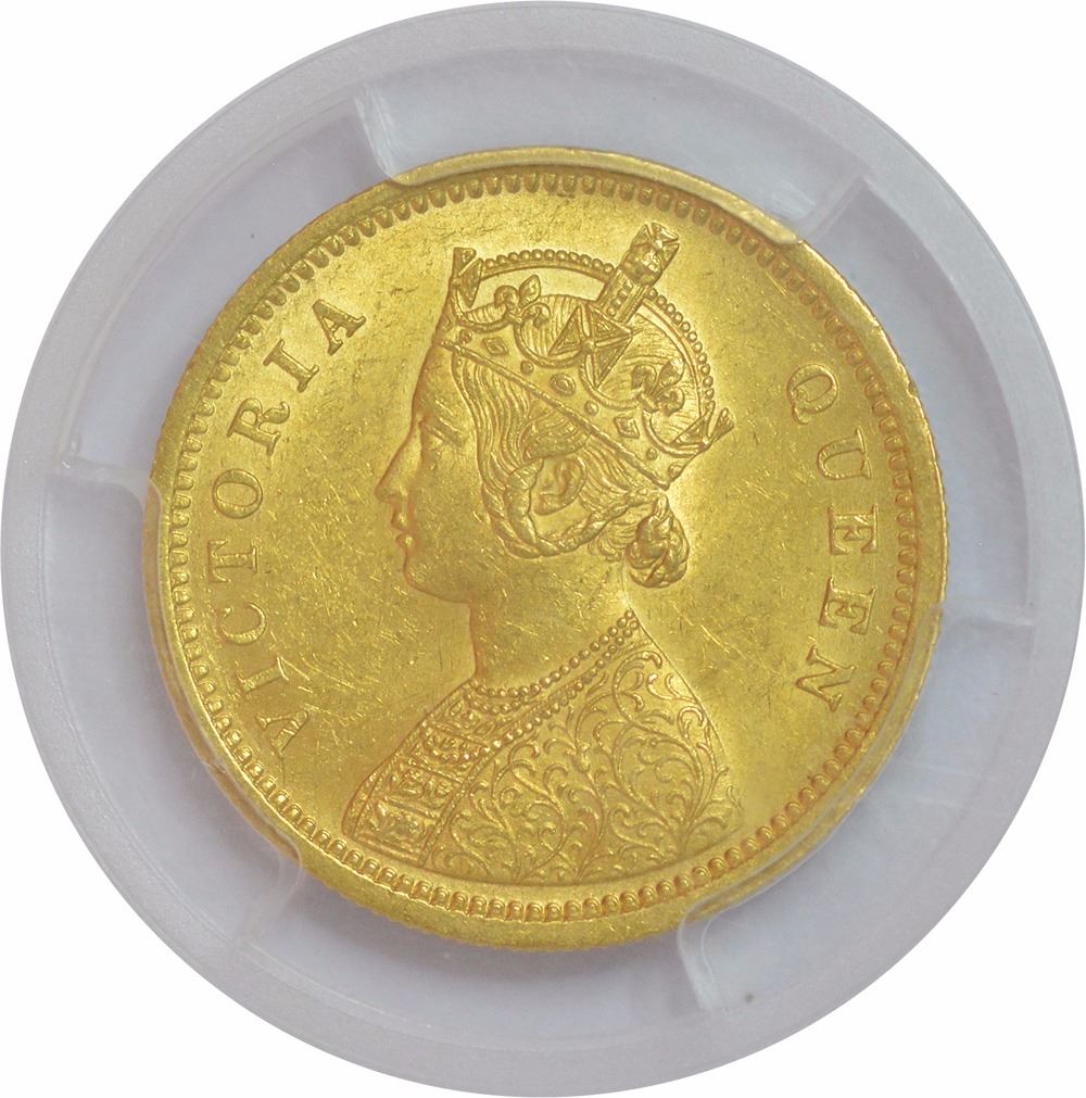1862, Victoria Queen, Gold Mohur, Calcutta Mint,single flower variety in panel, (PR # 1, SW#4.1),graded slabbed by PCGS as MS 62, Rare in this grade.
