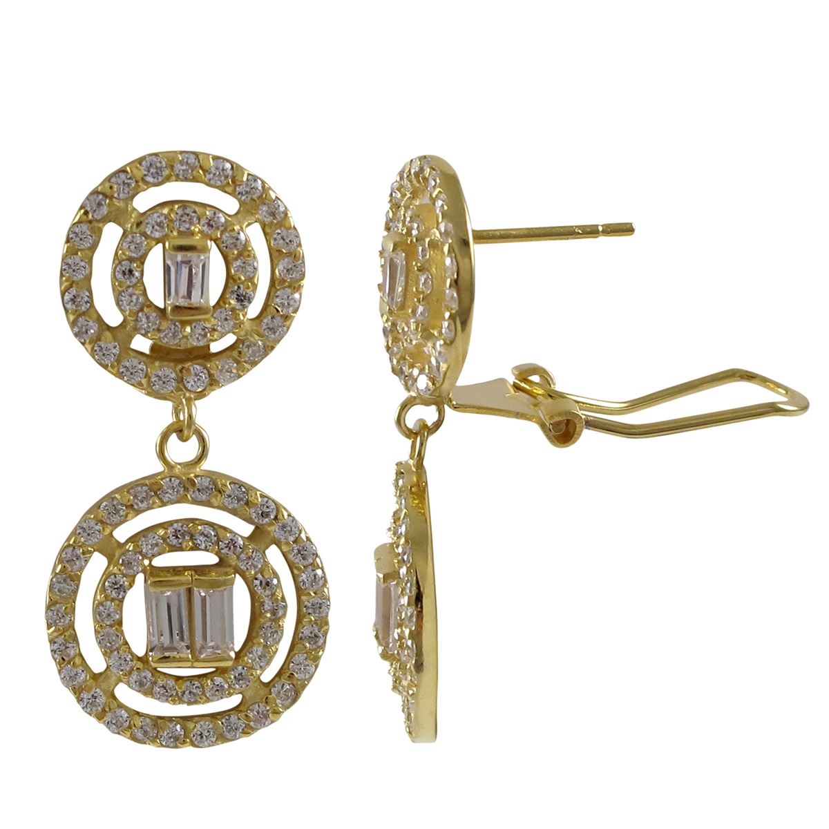 Gold Over Sterling Silver Double Circle Post Clip Earrings, White Czs