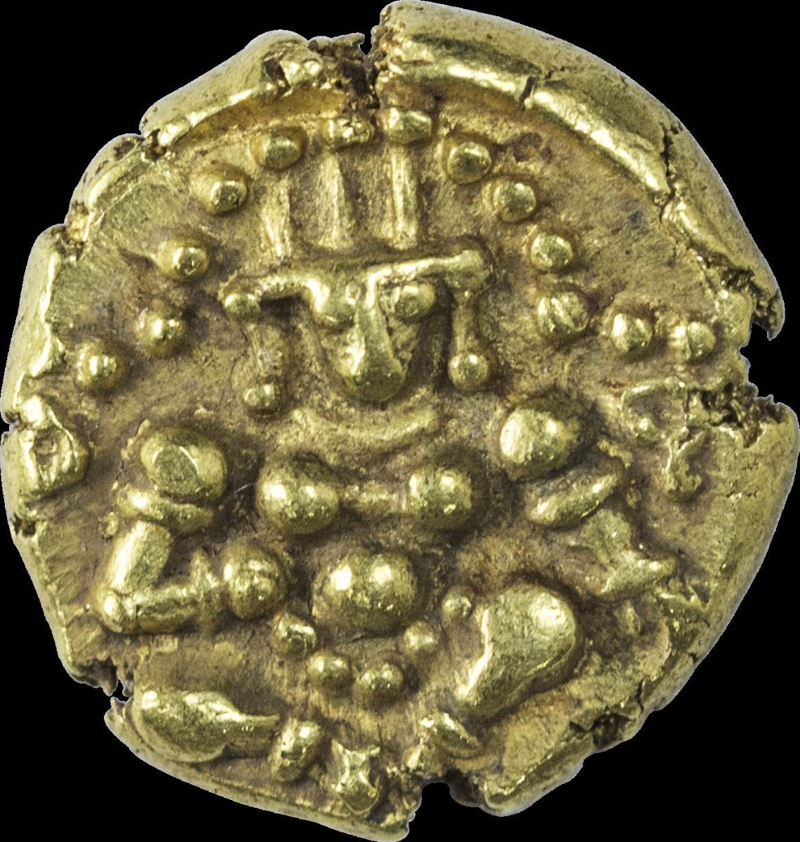 Vijayanagar Empire, Krishnadevaraya, Gold Varaha(Pagoda),Obv: balakrishna seated cross-legged facing, Rev: three line devanagiri legend: sri/pra/ta pa kri shana/ ra ya, 3.3g, 11.77mm, (Dr. M. Girijapathi #158),about very fine.