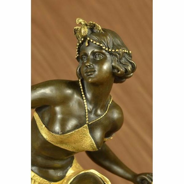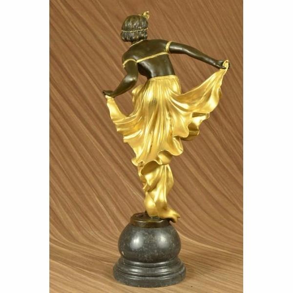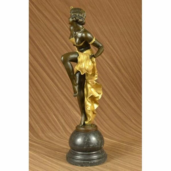 As Our Wild Flapper Dances Wildly She Smiles And Lifts Her Skirt Up High As She Dances The Night Away. She Bends Forward And Lifts Her Leg As Her Small Hard Nipples Poke Out From Her Top. Her Top Is Made A Material With A Textured Surface And Is Barely Being Held Up By A Beaded Neck Tie. She Is Barefoot And Carefree Of Her Exposure. Her Short Hair Is Held Back By An Interesting Head Piece In The Shape Of A Bird With A Bead Dangling From The Middle And Beads Wrapping Around Her Head. She Has Arm Bands With Studded Accents And Her Skirt Is Held In Place By A Belt With A Floral Imprint. As She Lifts Her Leg Up High She Pulls Her Skirt Out To The Side Creating A Gorgeous Caption Of Still Flowing Motion. The Sculpture Was Casted Using The Lost Wax Method And Has A Brown And Gold Patina . Bronze dimensions with marble base: Height 20 X Width 10 inches. Weight: 19 lbs.