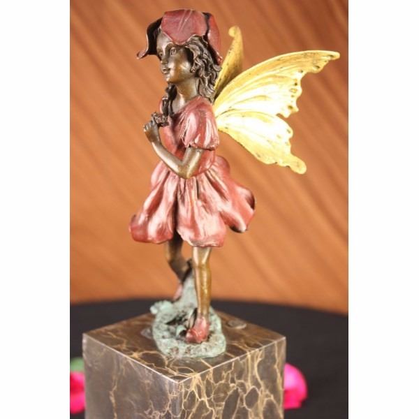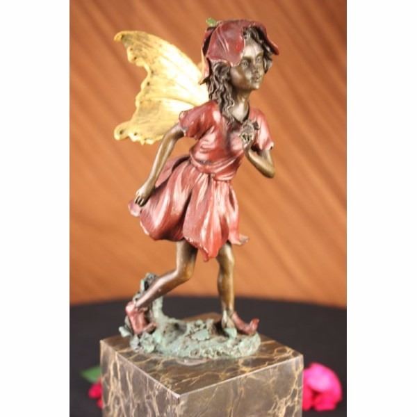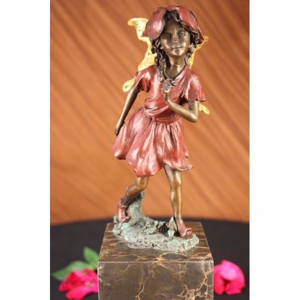 Daydreamers will fall in love with this daydreaming fairy. Filled with youthful curiosity, she wanders around the mystical forest, her eyes taking in all the magic around her. She is lulled by the soft sounds of life and fantasy around her. Her ears perk up and she follows the singing birds and soft flutter of butterfly wings. Her fairy wings arch behind her. She wears a red patina dress, matching hat and shoes. Her footsteps fall on the green patina grass. This would make a sweet addition to any little girls room. This sculpture was cast using the lost wax method and mounted on a marble base. Bronze dimensions with marble base: Height 12 X Width 3 inches. Weight: 8 lbs.