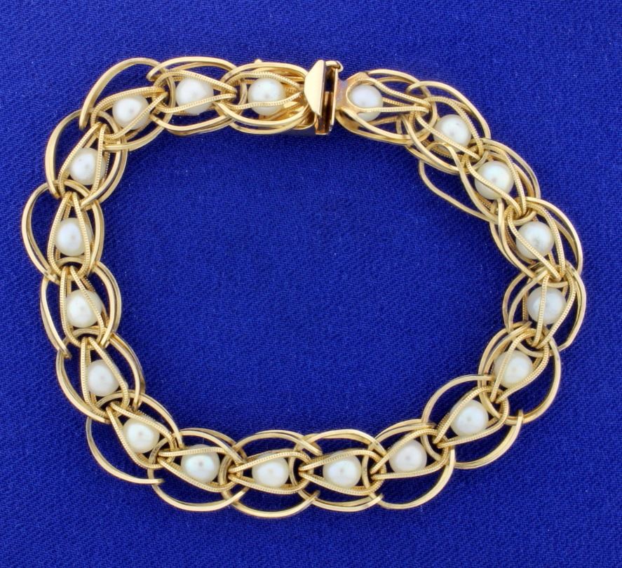 14K yellow gold and contains nineteen 5mm pearls with great color. The bracelet is 7 1/2 inches long with a safety clasp. 13.8g